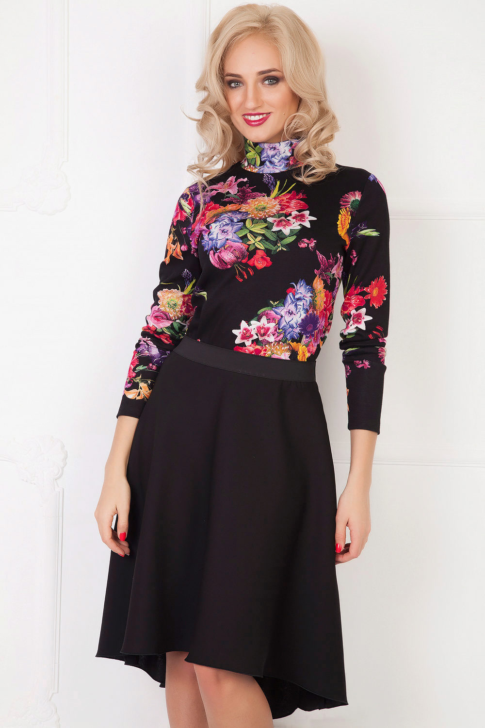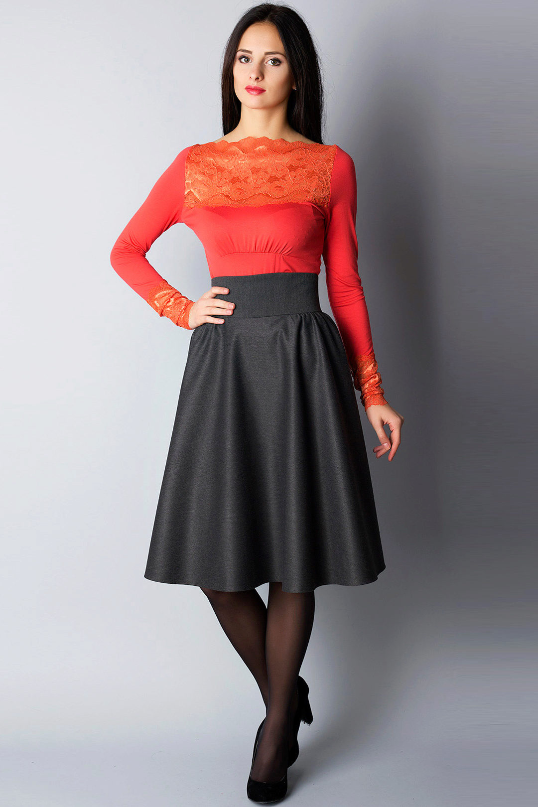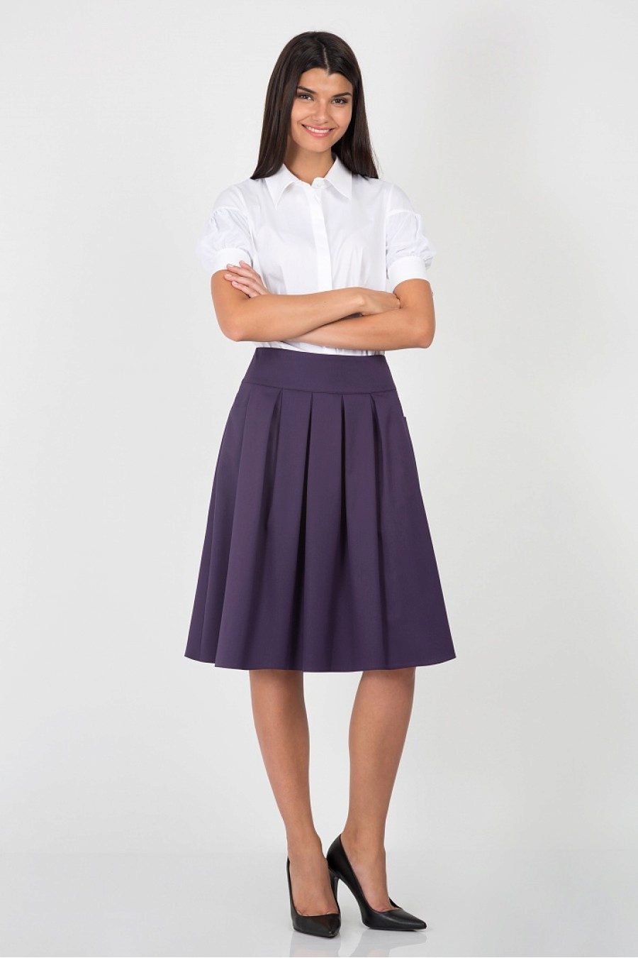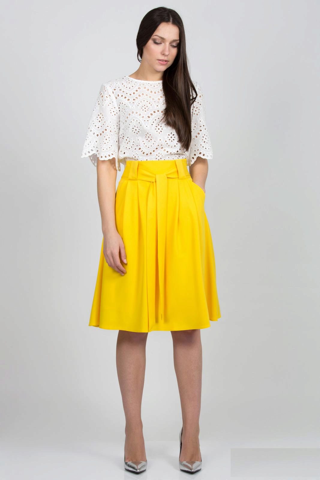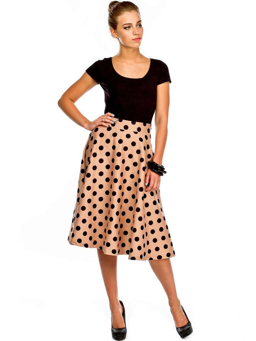 The semi-sun skirt has a free cut, so all women of any height, age or body type can wear it. This style looks beautiful on girls with a silhouette resembling an hourglass.