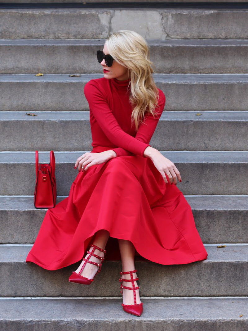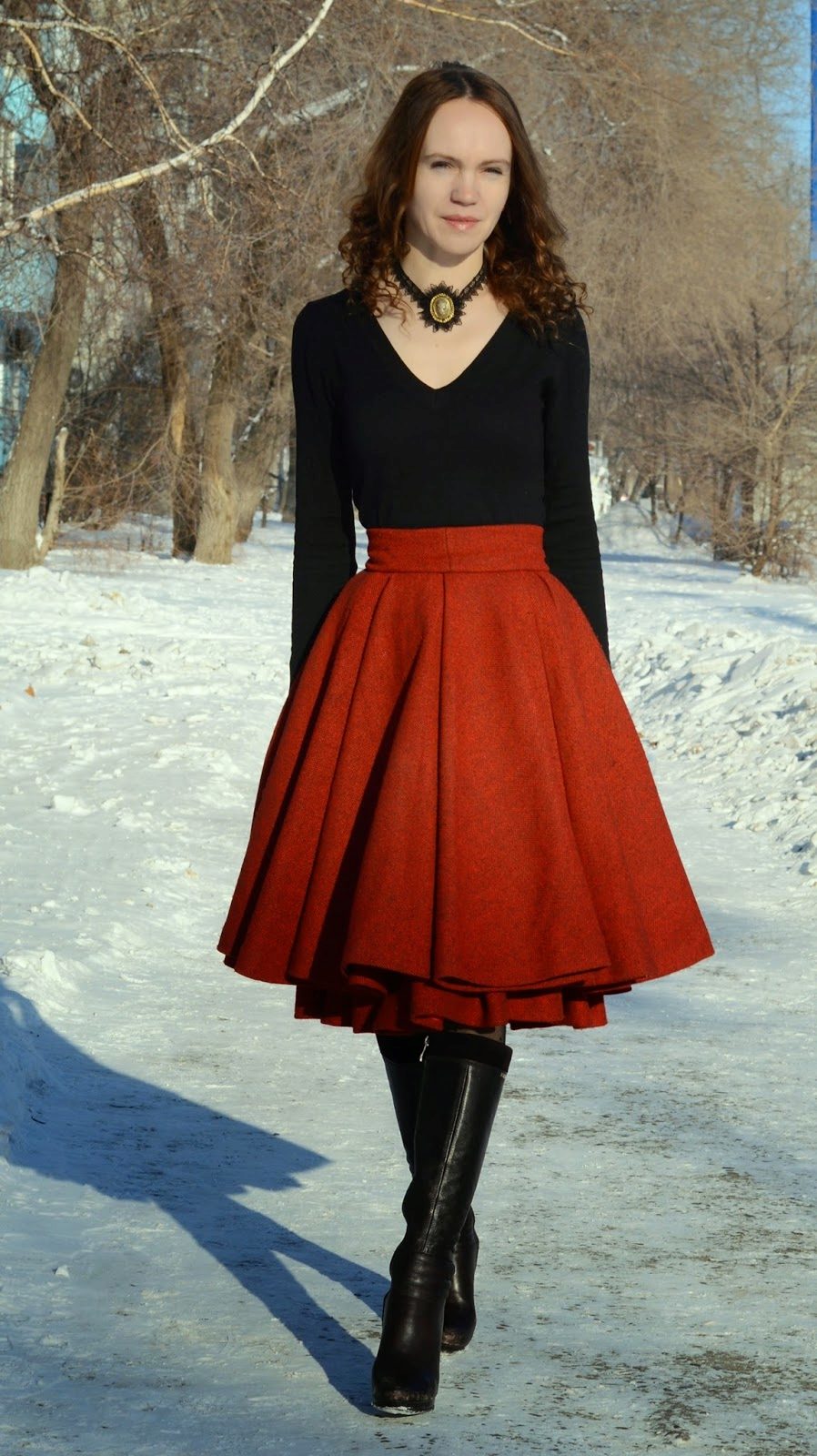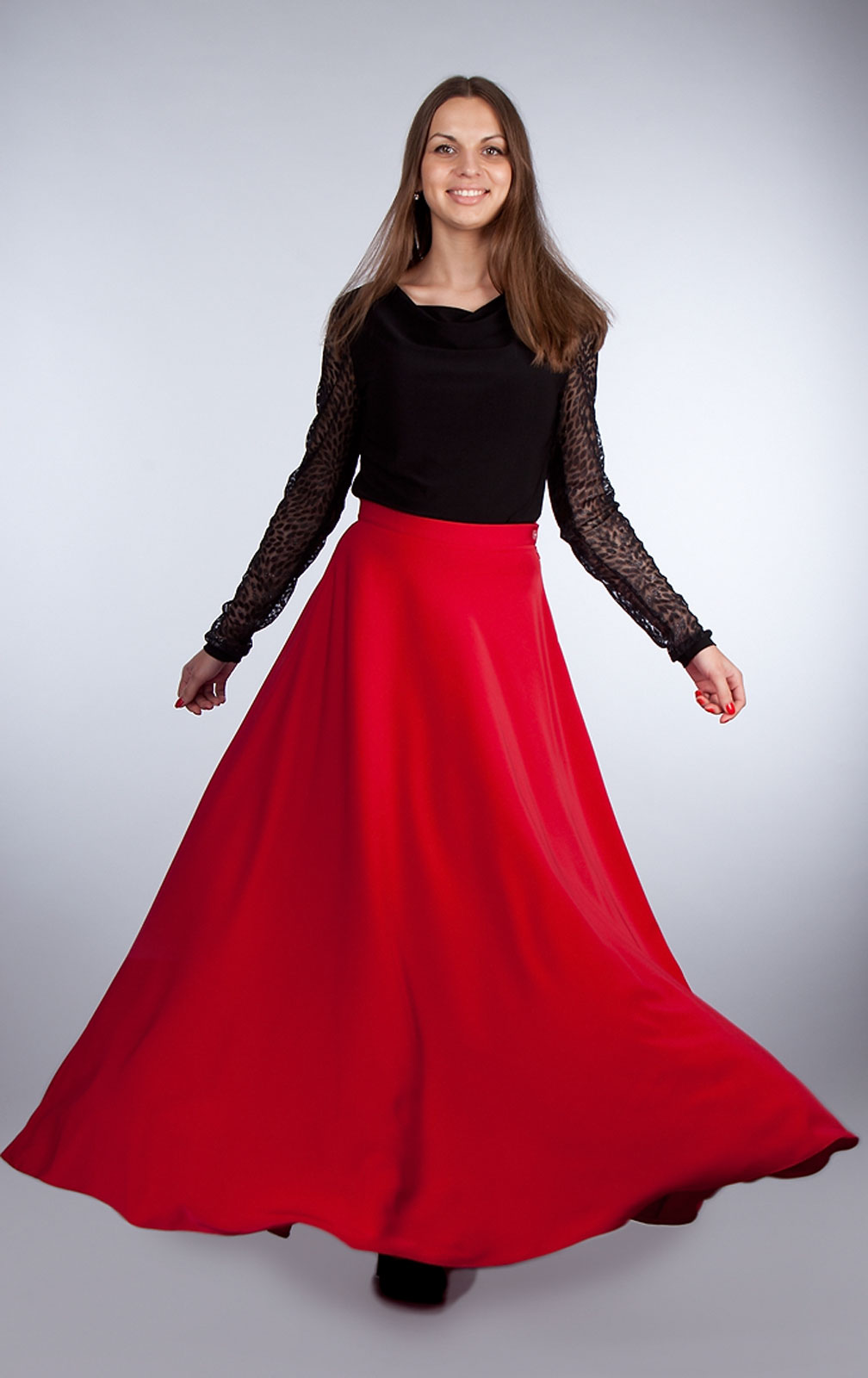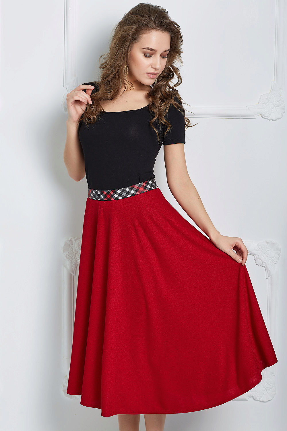 Red color is the personification of passion and femininity, so many girls prefer it. Red fluffy skirts add extra expression to the image. This outfit is perfect for parties or special occasions. You’ll be the center of attention in the red half skirt.
