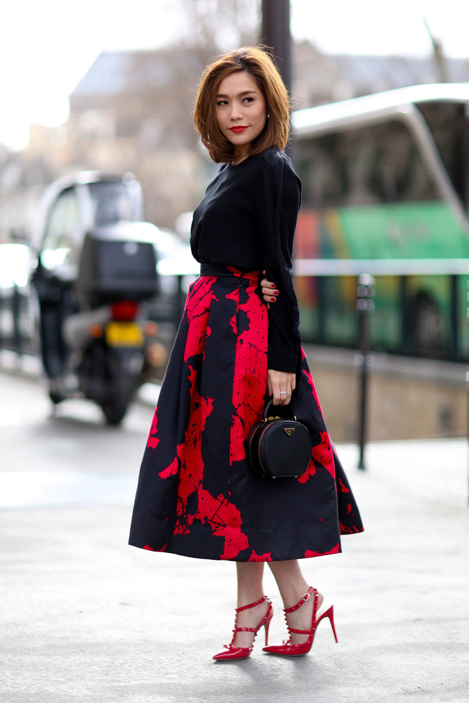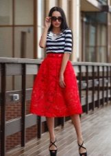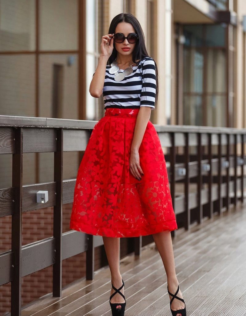The best addition to the bright red skirt will be black or beige top. Also a good option is a white or striped top.