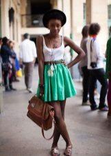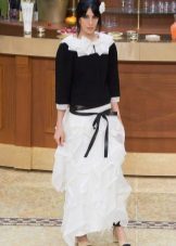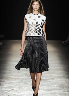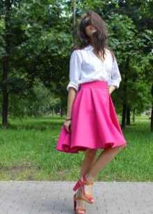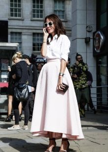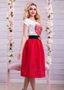 Bulky skirts of this color look soft and airy. These are often tulle and lace patterns. They are rarely combined with a white top, often choosing something contrasting, for example, gray, green or red top. A blue top is considered a good addition to a white skirt. A white skirt with a black and white striped top looks impressive.