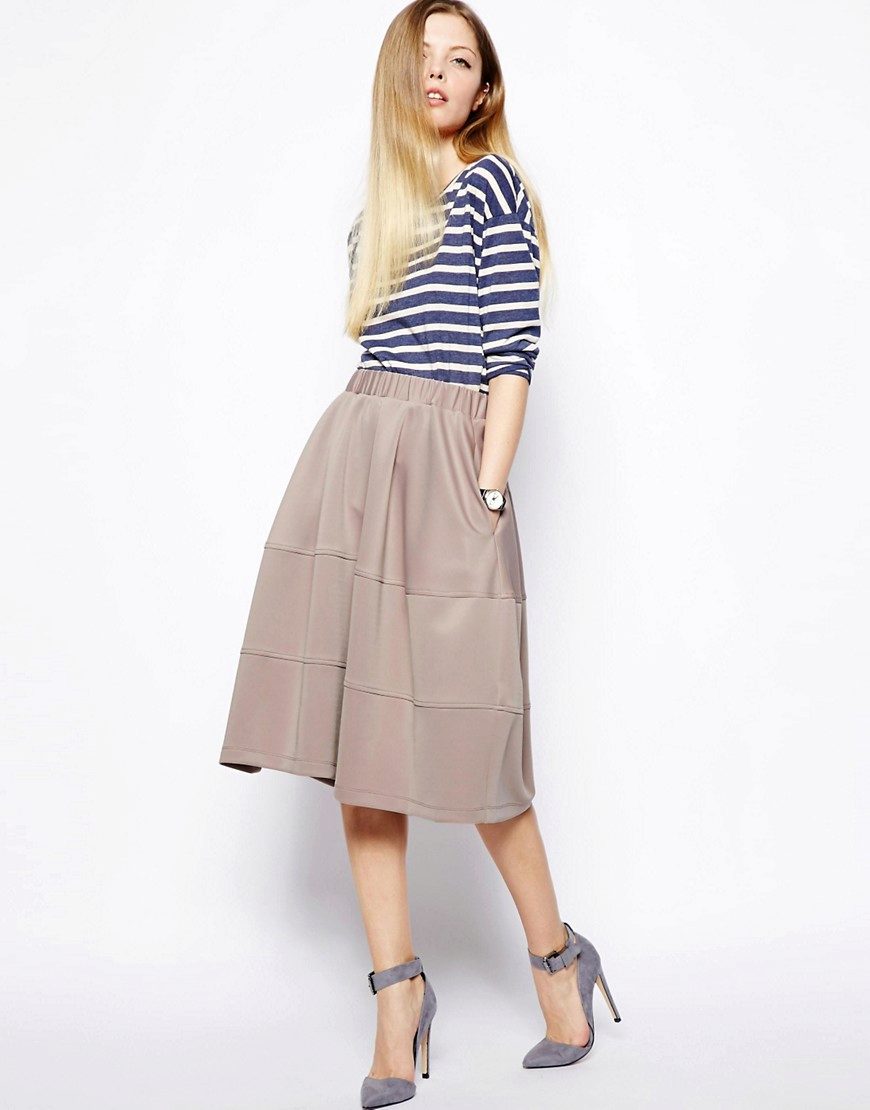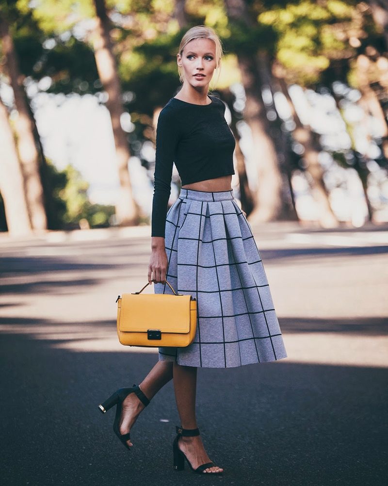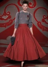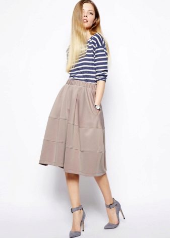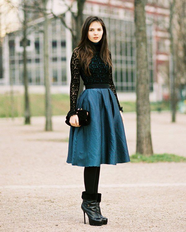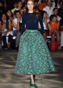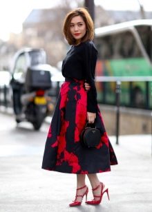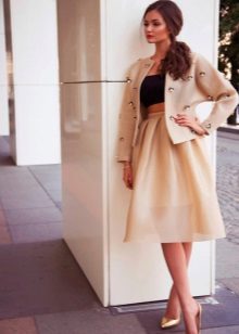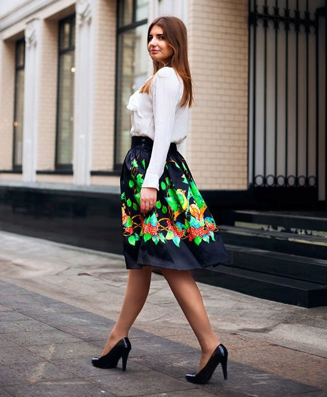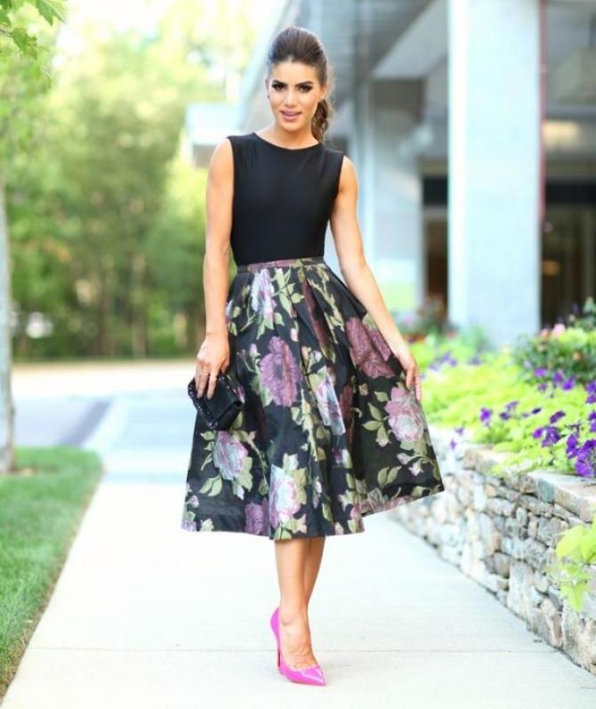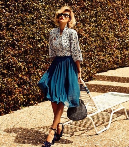 Medium length fluffy skirt is called universal because it can be worn both in the office and for a walk or at a fashionable party. If it is a tight skirt for a business outfit, a fitted jacket and classic shoes are selected for it. For the casual version, the top should be calm and low-key.