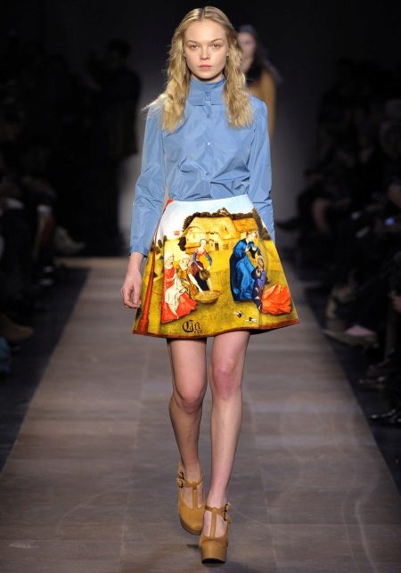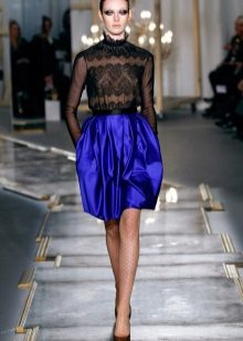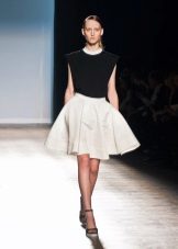 Creating images with such a skirt, you should remember the rule - the shorter the fluffy skirt, the more modest the top should be. And therefore with such a skirt the top with a stand, a neat neck “boat” or a collar looks perfect.