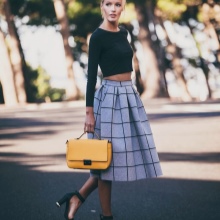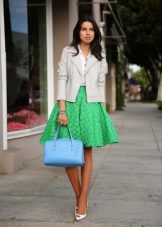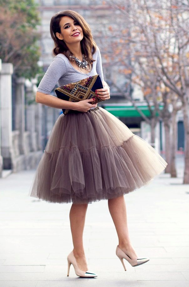 Small bags on a chain or clutches look good with fluffy skirts. The use of a belt will help emphasize the waist, and bright jewelry should be abandoned.