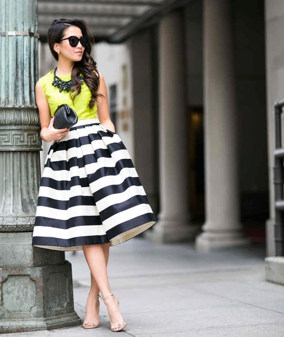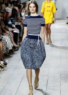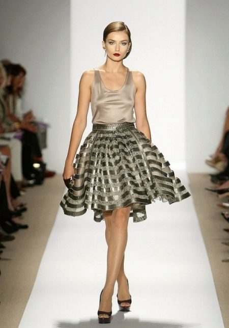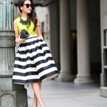 Puffed skirts with stripes are no less common. Stripes on such skirts are most often large and are arranged horizontally. Also often found skirts of this type, made of checkered fabric.