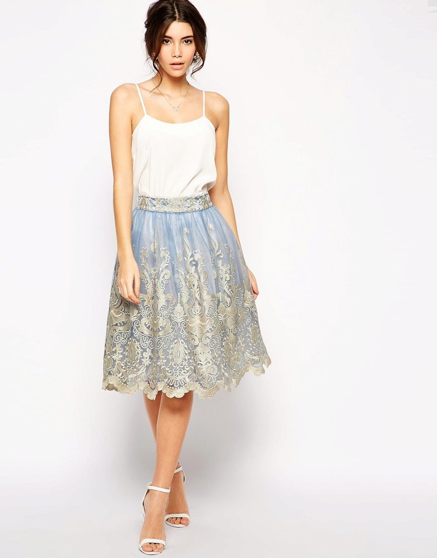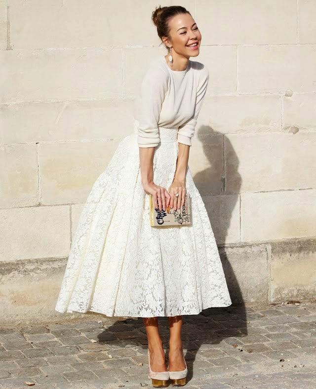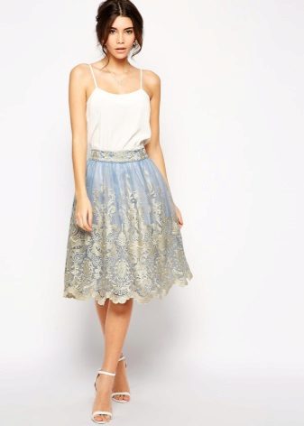 Fluffy skirts made of guipure or lace - elegant, feminine and very stylish. They are often presented in pastel colors or white, in which case they are combined with a light top and classic shoes.