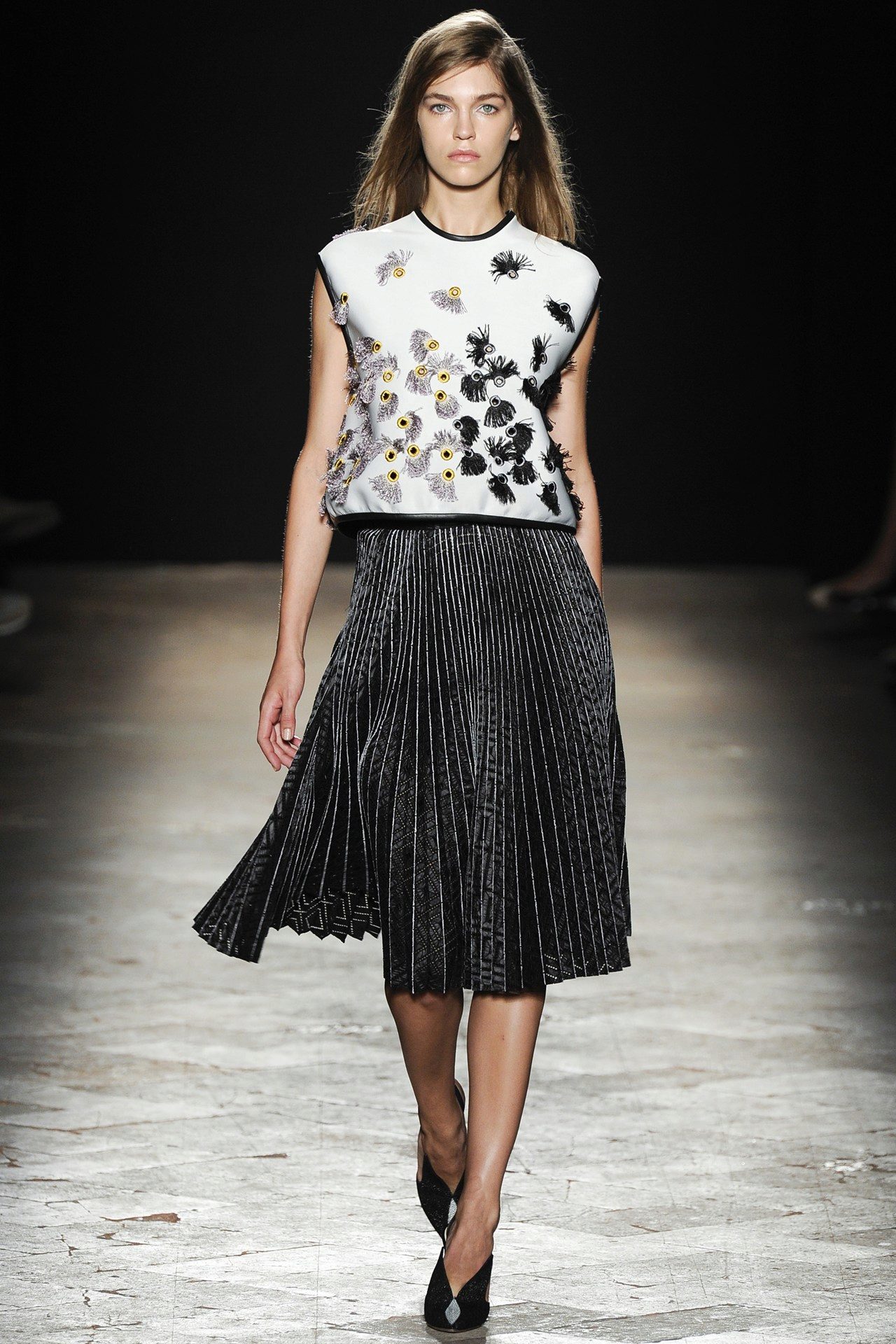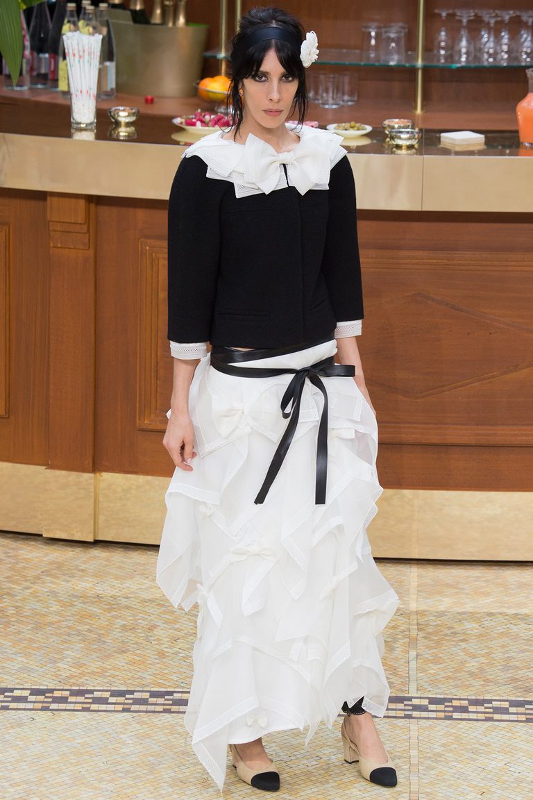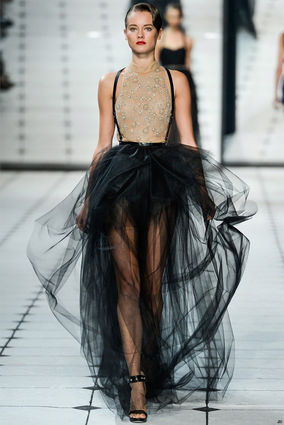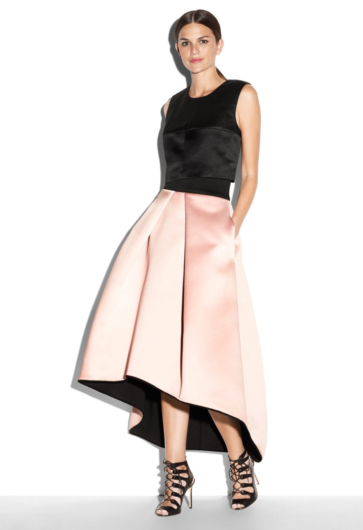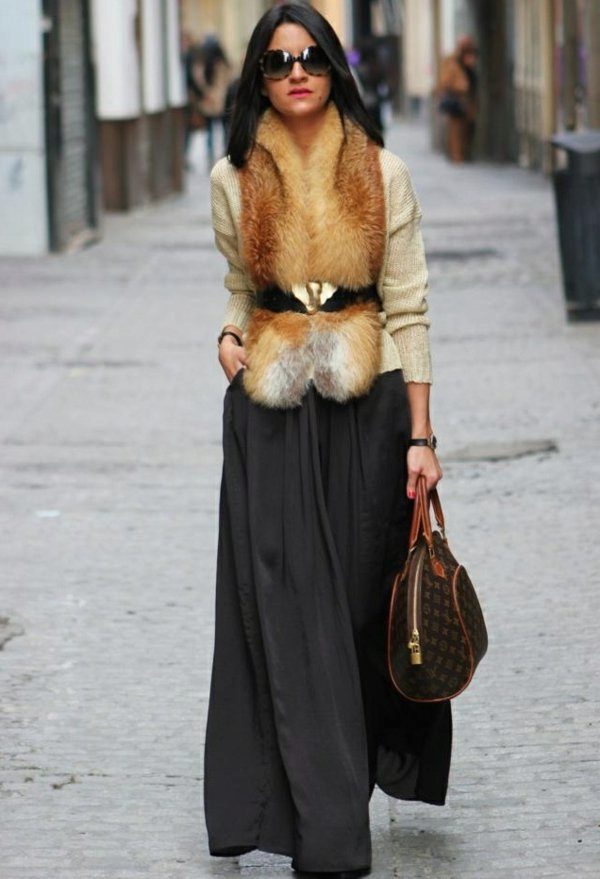 - A long fluffy skirt in combination with a top with décolleté and stiletto shoes is used to create a romantic evening look.