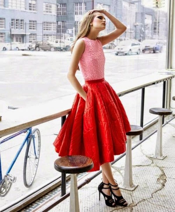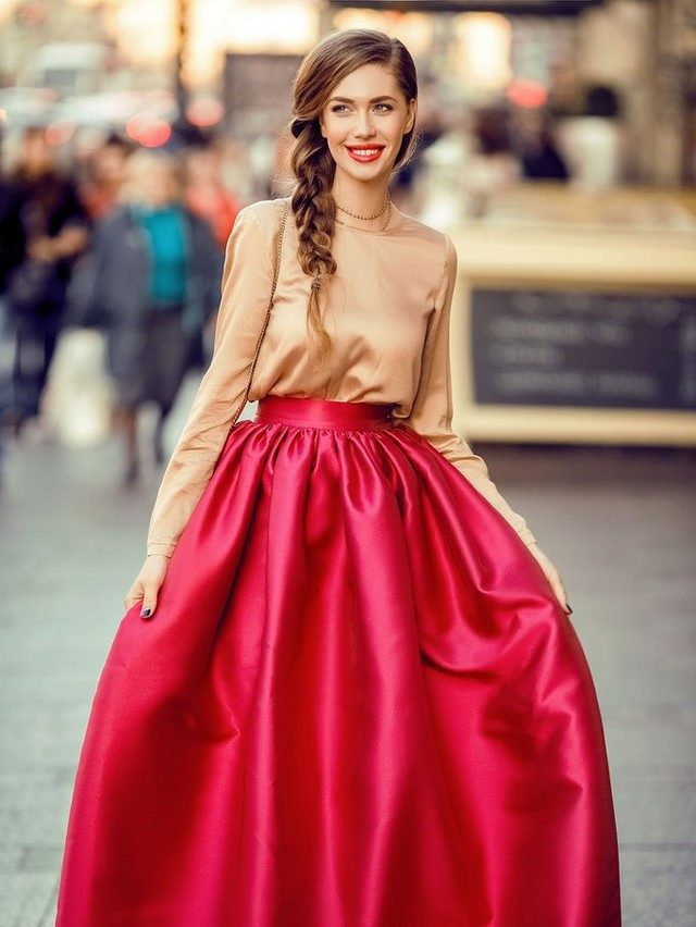 Fluffy skirt of any shade of red palette looks luxurious and attracts looks.