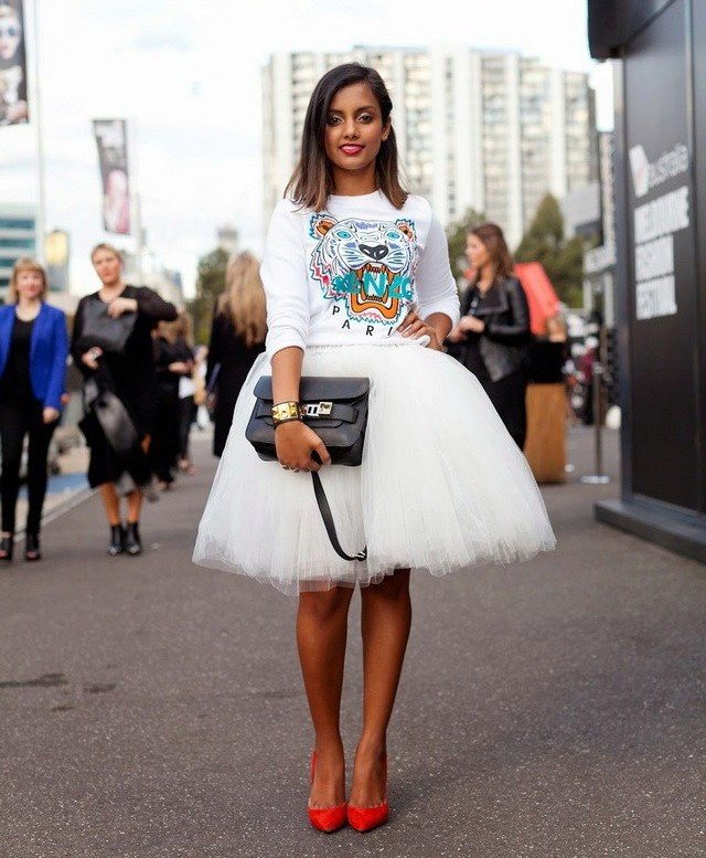 - Using a fluffy skirt in the street style, they put on a light shirt of contrasting color and ballet flats.