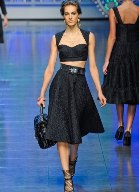 High waist in them is often framed in the form of a corset or supplemented with lacing. As a top of the outfit, they prefer skin-tight tops and blouses, turtlenecks and bodysuits. Sew models with high waists from both light fabrics (lace, chiffon), and from more dense materials.