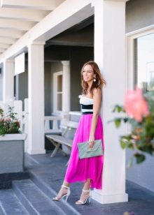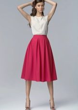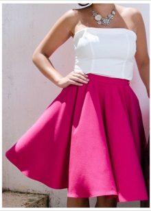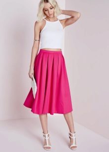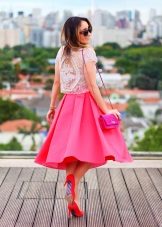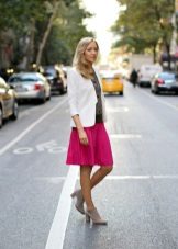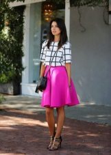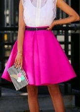 - Pink skirt creates good ensembles with different elements of the wardrobe, and the choice of colors is diverse. A model of any pink color always looks harmoniously with a white top or blouse.
