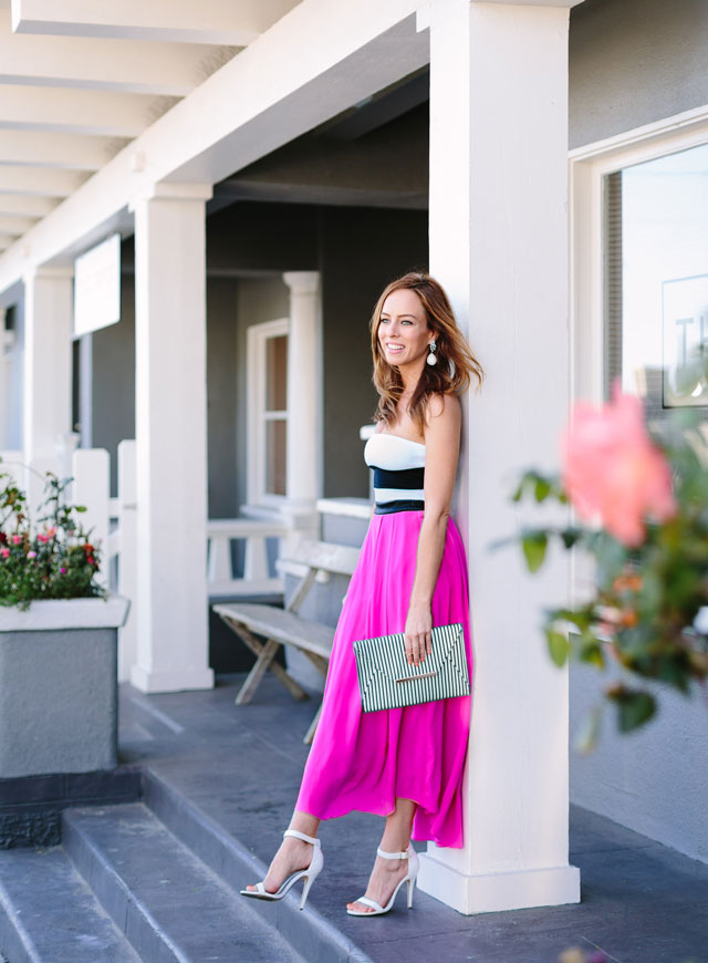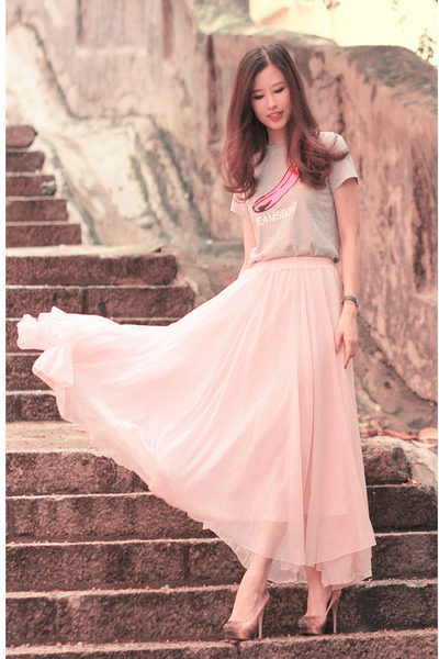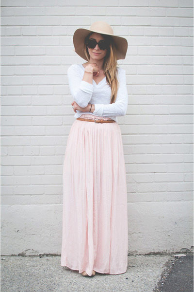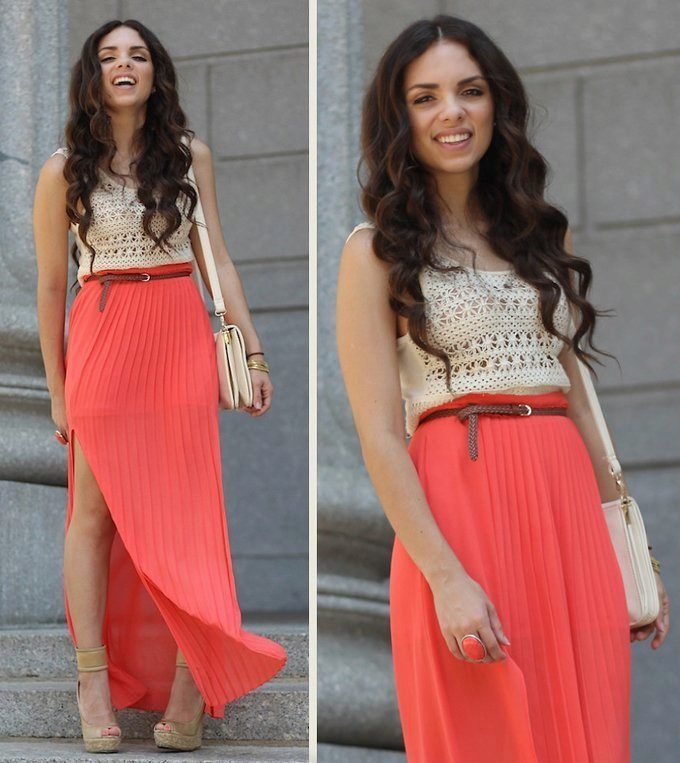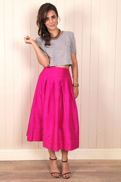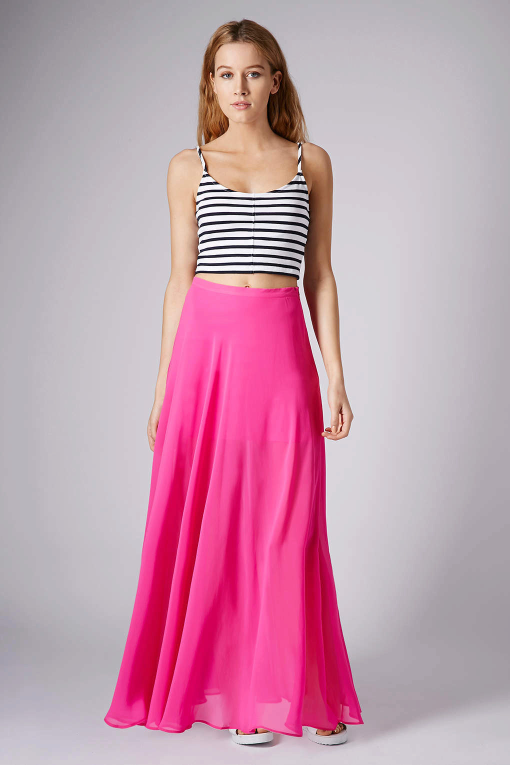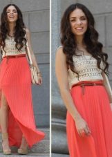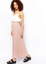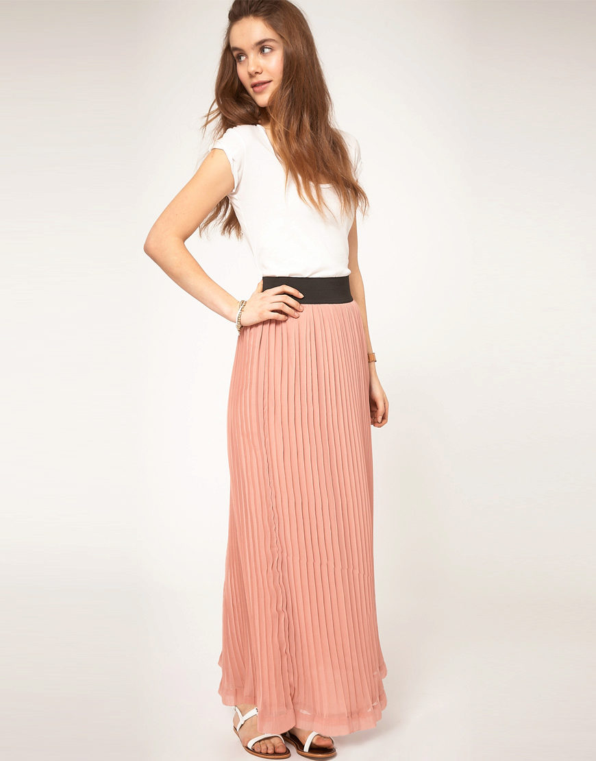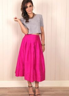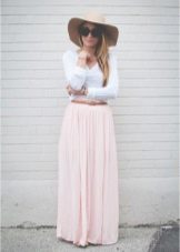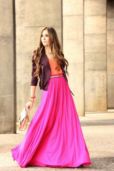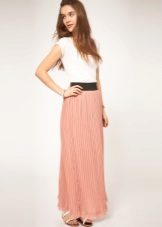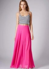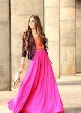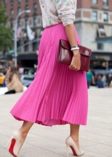 - The skirt of the pleated maxi length of bright pink color harmonizes beautifully with a calm t-shirt, spectacular jewelry and barefoot sandals.