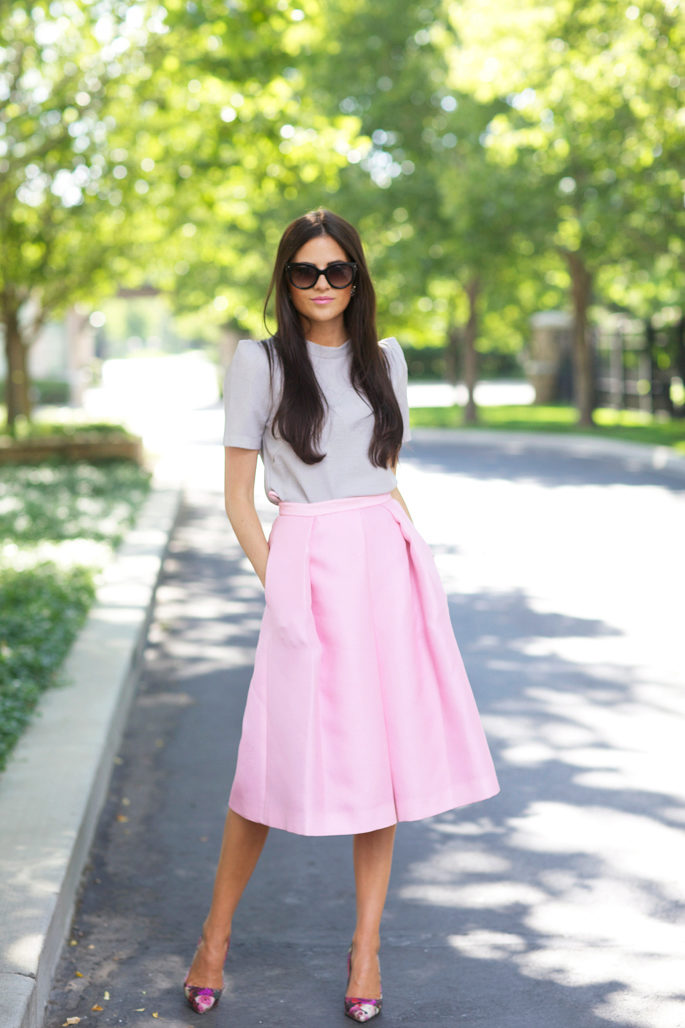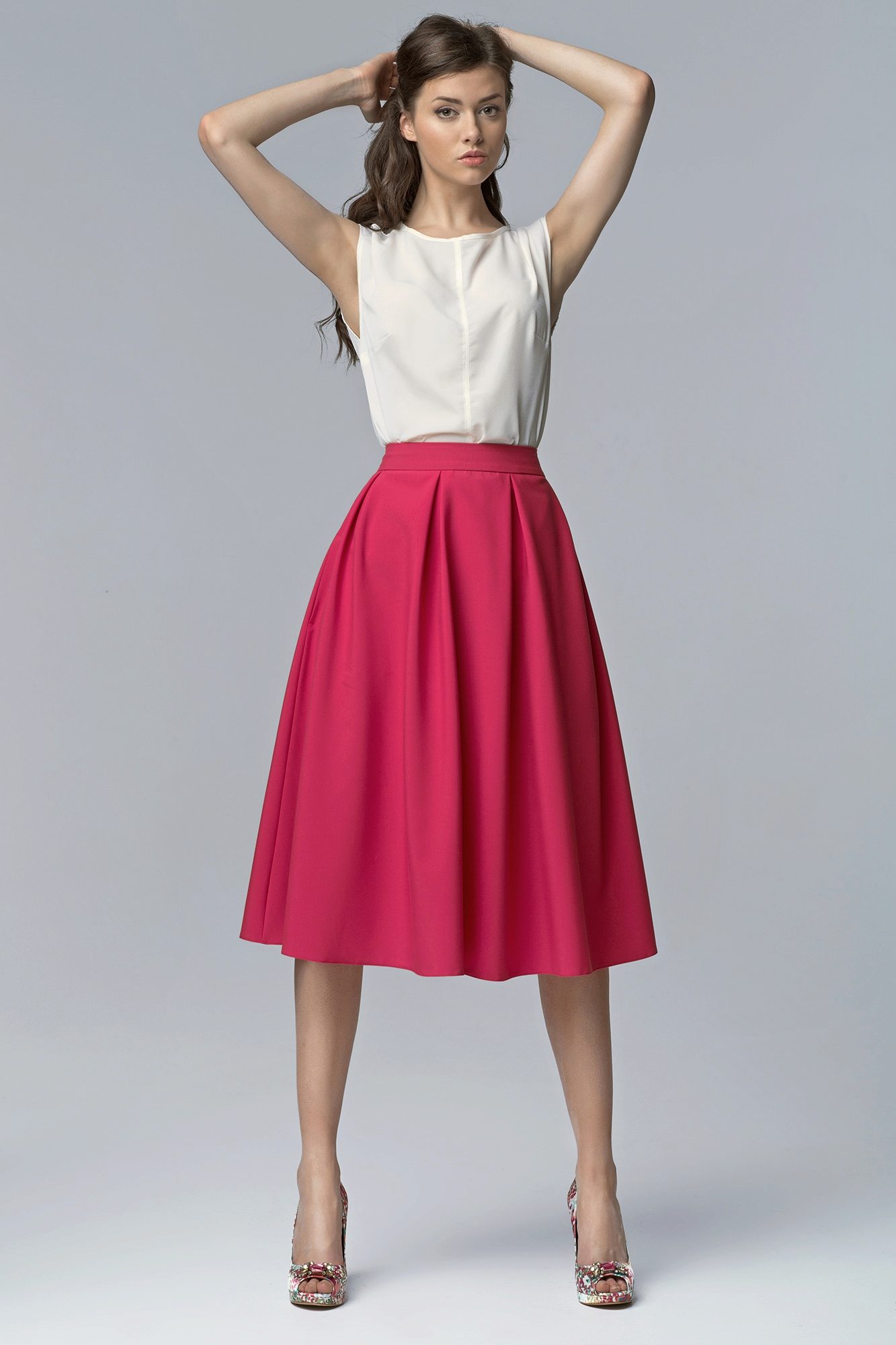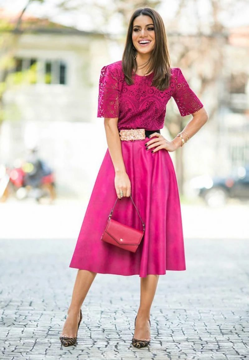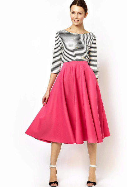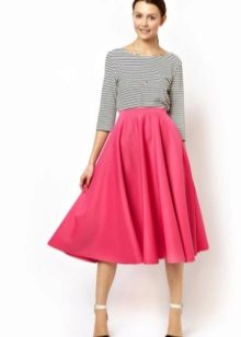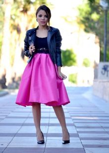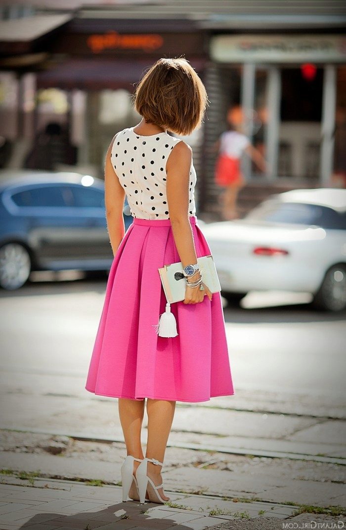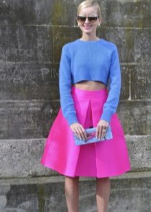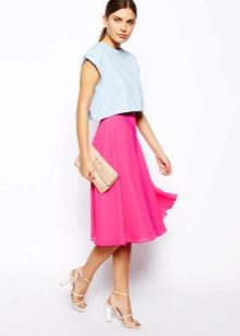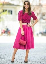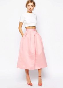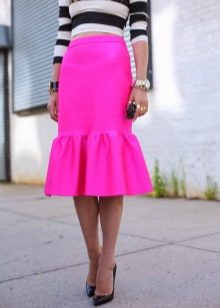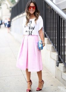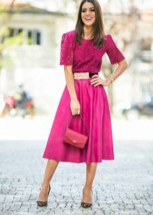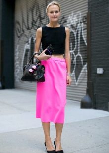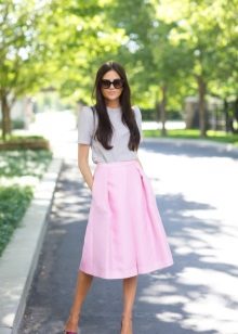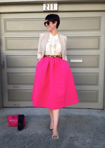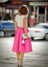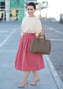 Owners of magnificent forms should prefer a pink midi skirt. The choice of style depends on the type of figure, although the pencil or tulip skirt suits many full girls. If you want to divert attention from the zone of the hips, then the length slightly below the knee is optimal.