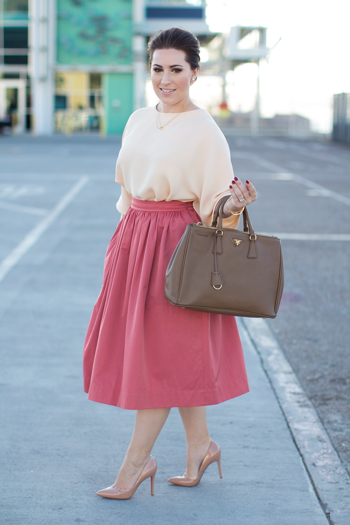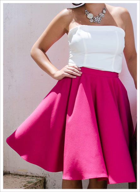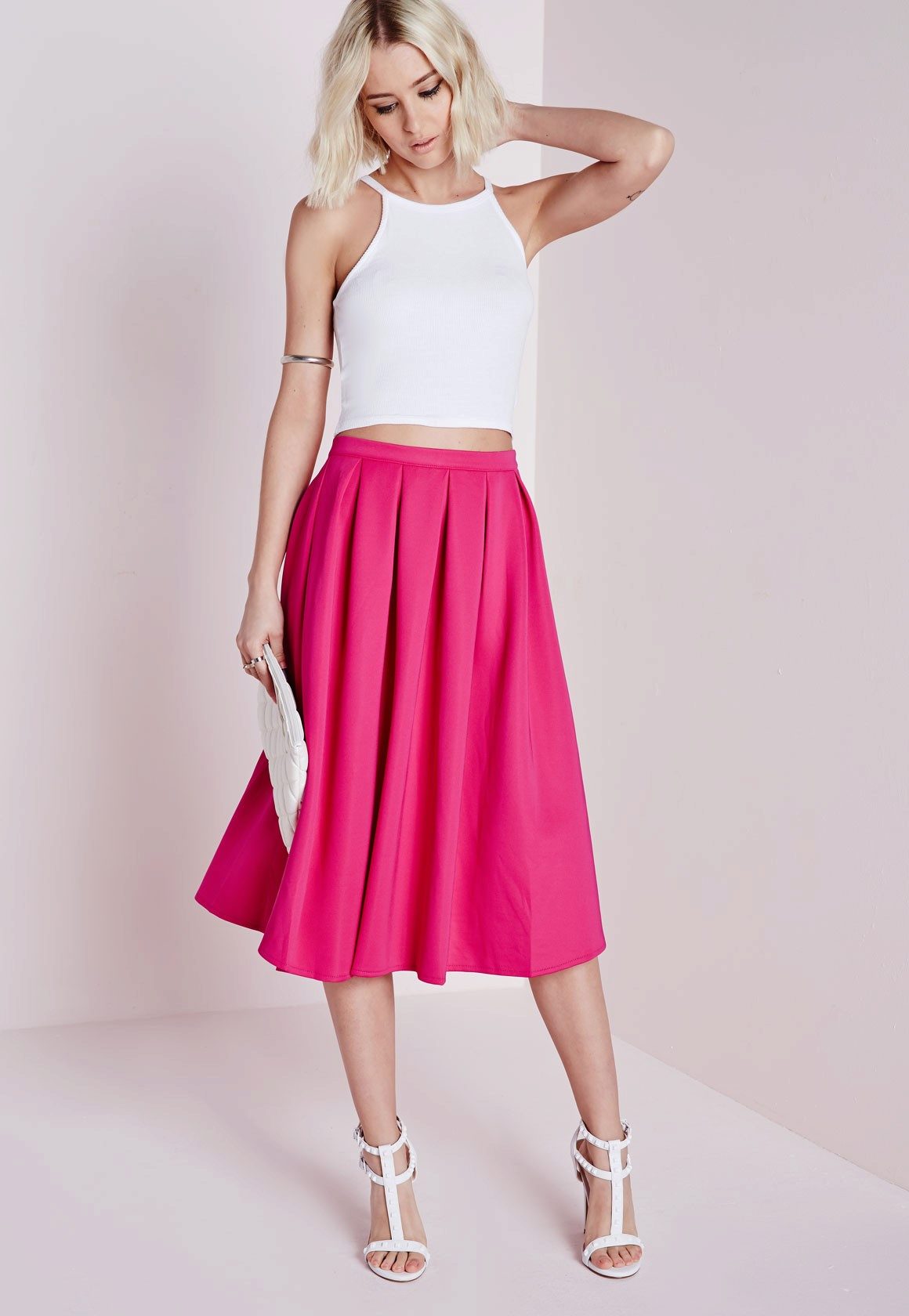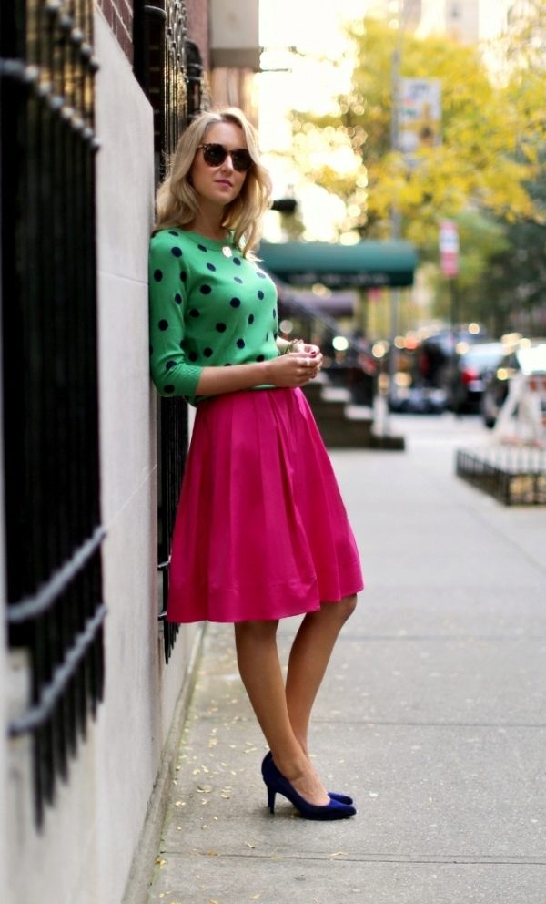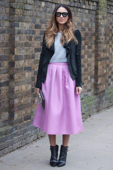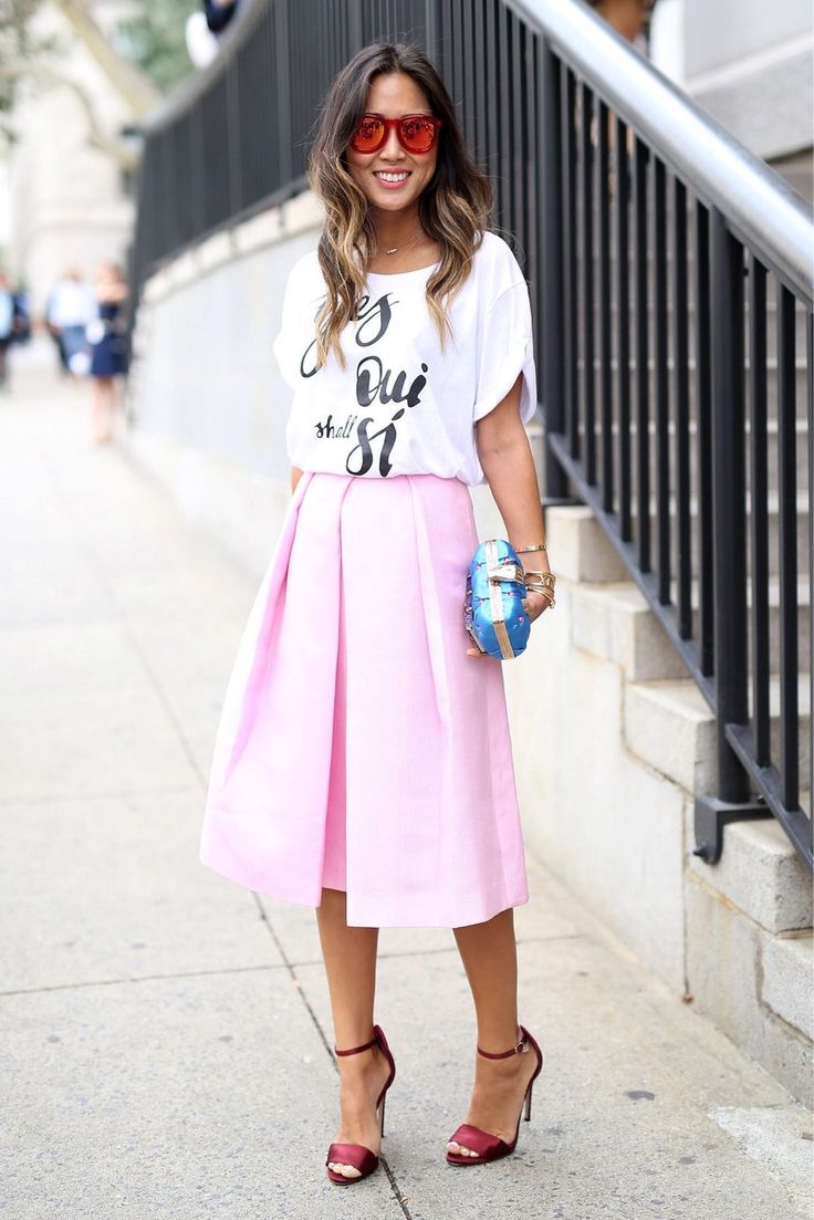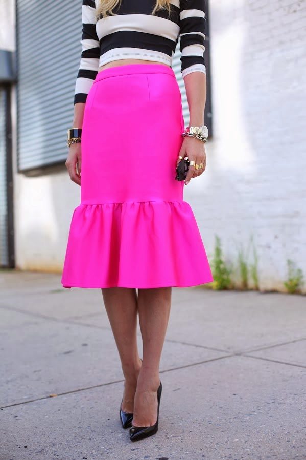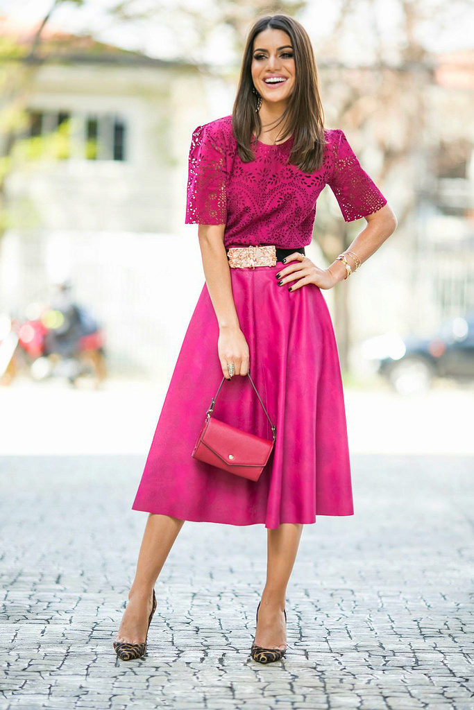 Owners of magnificent forms should prefer a pink midi skirt. The choice of style depends on the type of figure, although the pencil or tulip skirt suits many full girls. If you want to divert attention from the zone of the hips, then the length slightly below the knee is optimal.