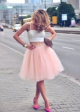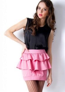 Many women of fashion prefer skirt with basky. It is the pink model that is ideally complemented by the Basque, since this element is feminine. For the embodiment of a spectacular bow, you should choose a white top and shoes. A bright accent in a fashionable image will be a red color clutch.