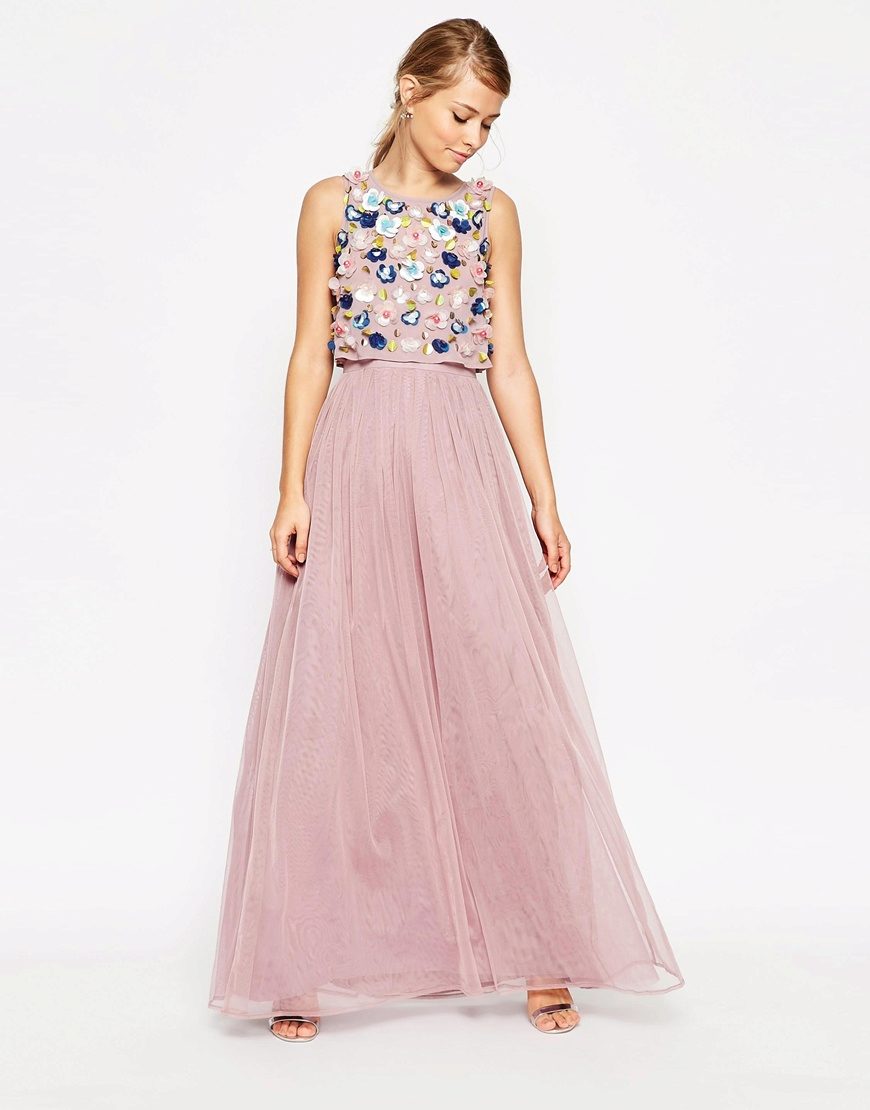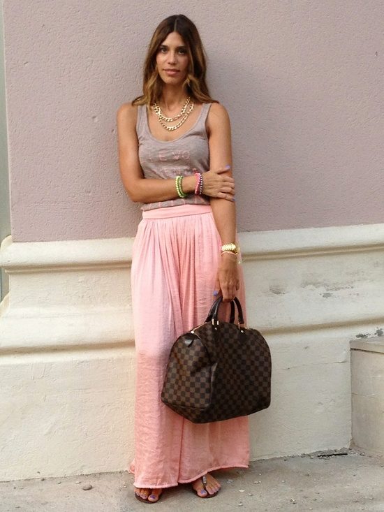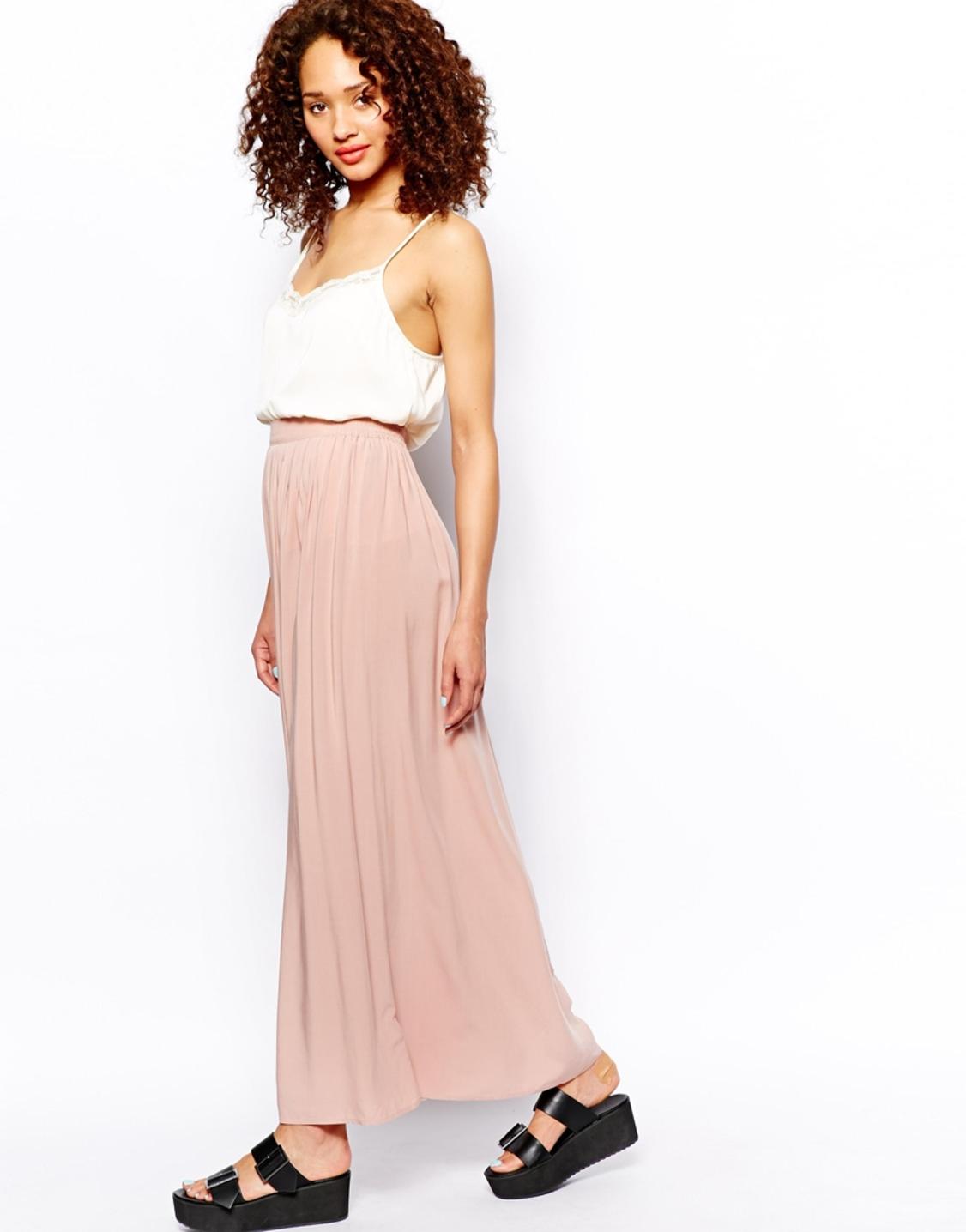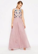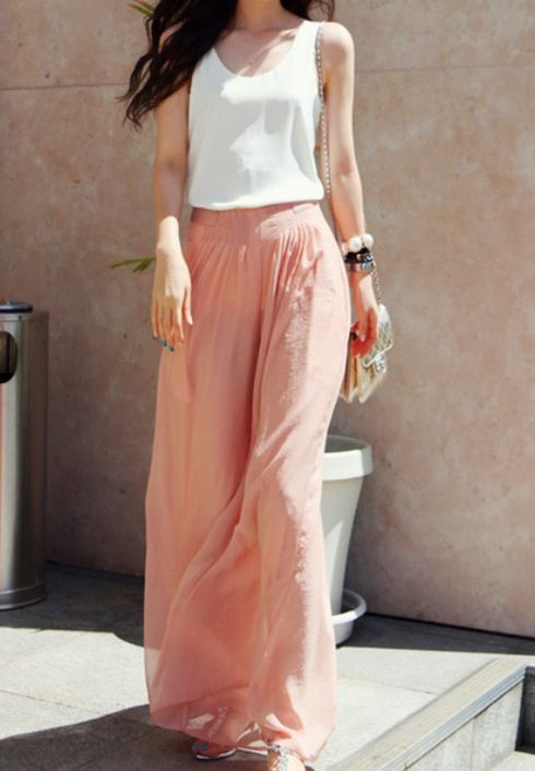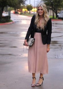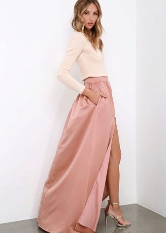 - An elegant pink skirt in a floor of silk, complemented by an elegant black top, looks beautiful in tandem with stiletto heels and expensive jewelry. Such an evening look will help to decorate any evening.