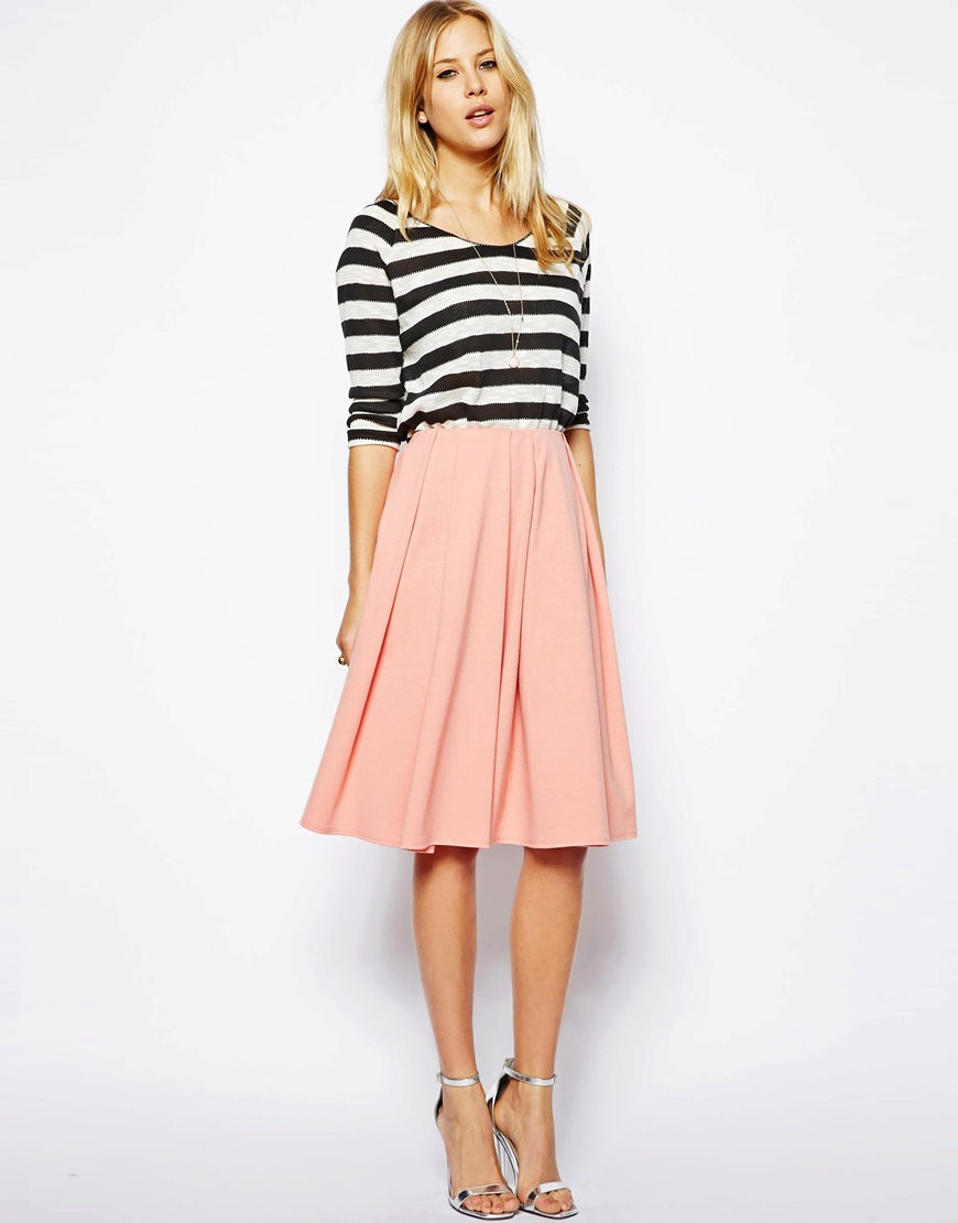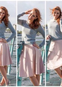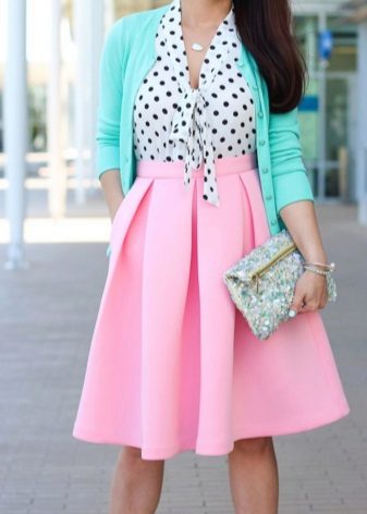 - A faded rose color skirt blends beautifully with a blouse or dark-colored top. You can opt for blue or gray. The model of bright color from dense fabric is perfectly combined with a beige cardigan.