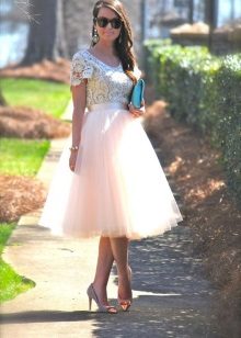 - The skirt-pack of guipure and pale beige top is well combined with sandals with high heels. For an embodiment of an image of the coquette it is necessary to give preference to womanly jewelry.