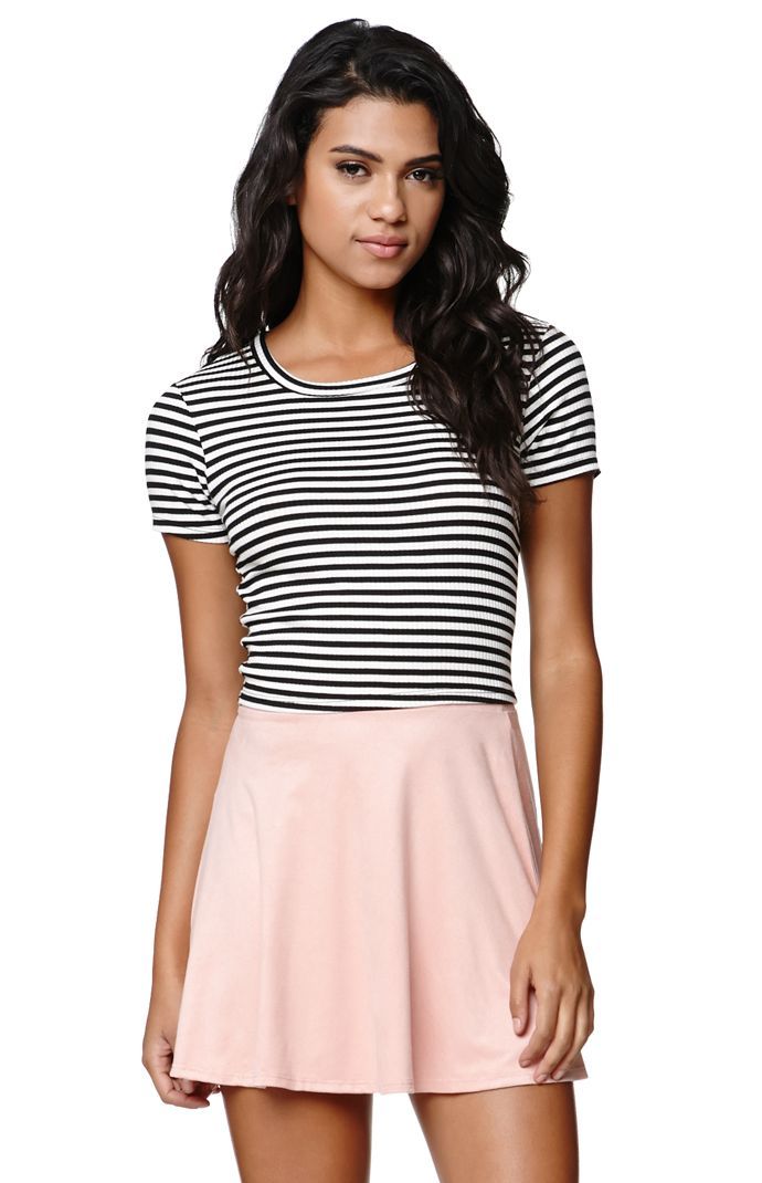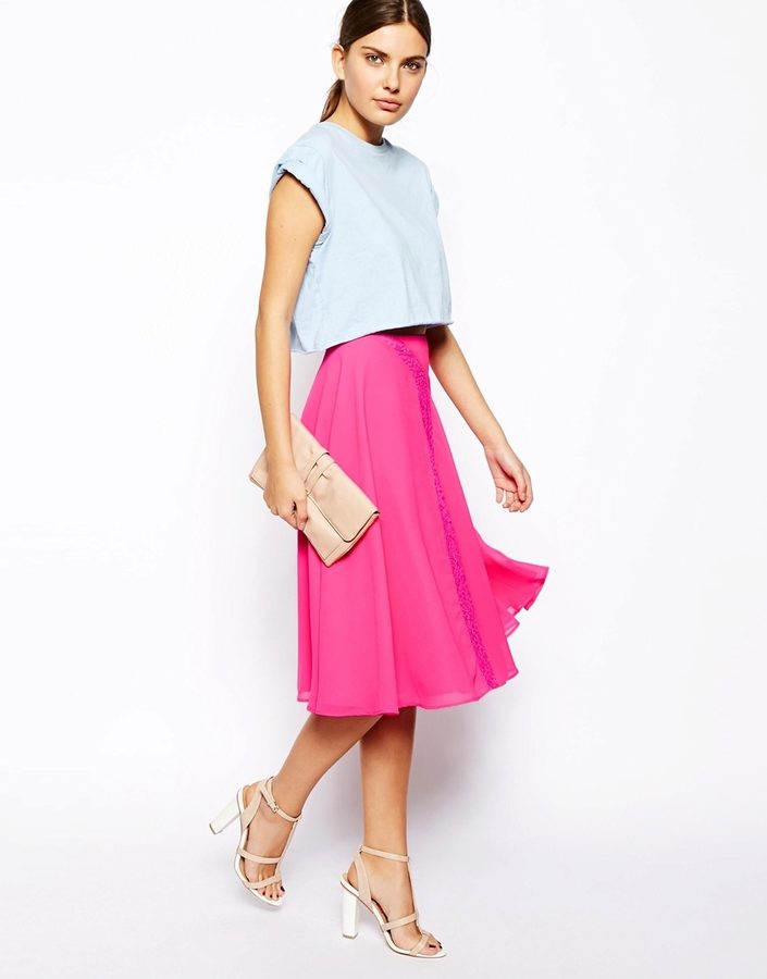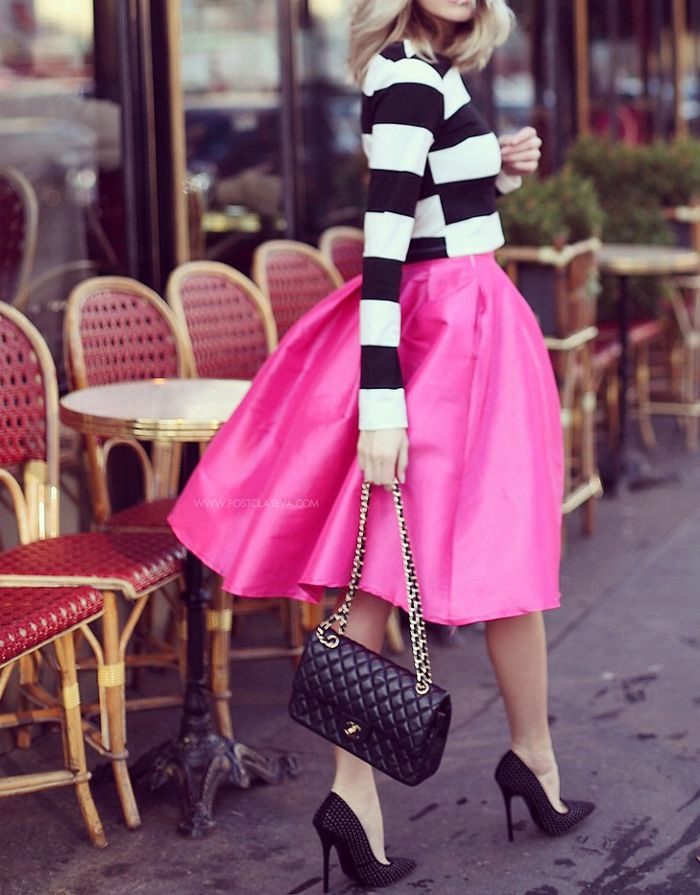 A great combination is pink with white or blue. For example, a flared skirt with a tight white top will help create a gentle and effective look. The perfect complement will be accessories in blue.