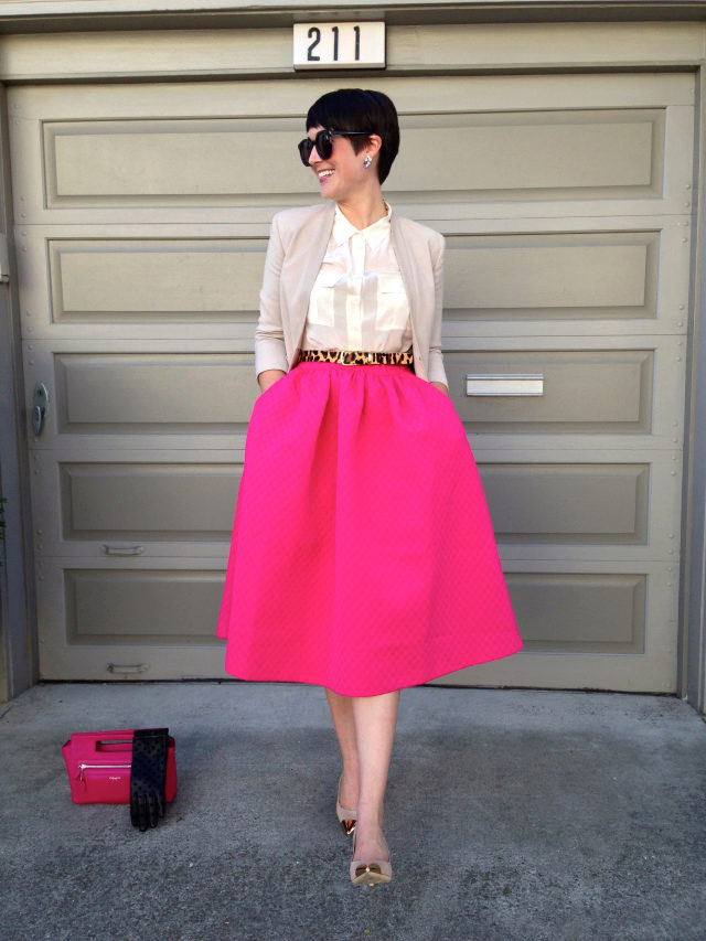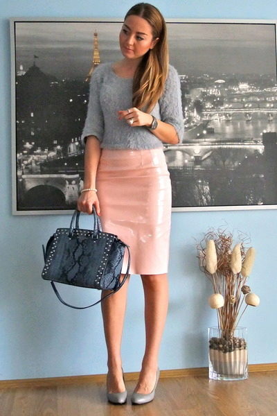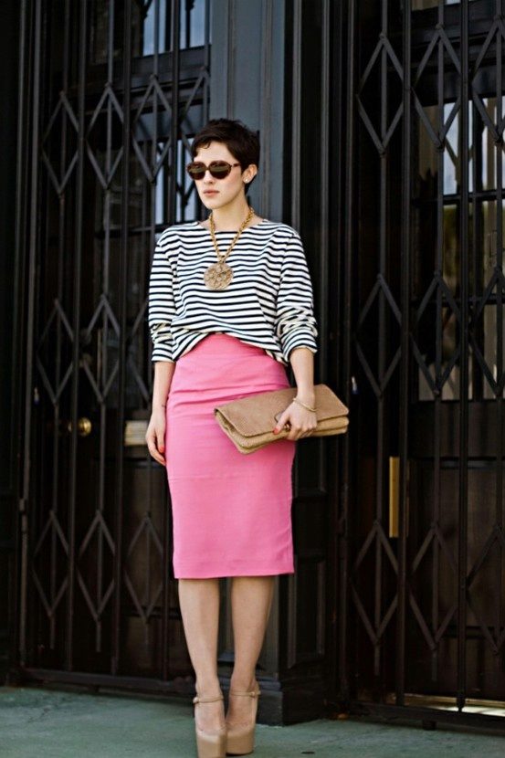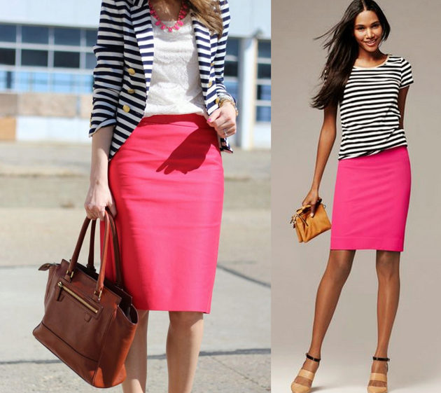 A pink pencil skirt can also be worn for a walk. Just need to pick the right shoes and top neutral colors. Ballet flats or pumps perfectly complement the stylish bow.