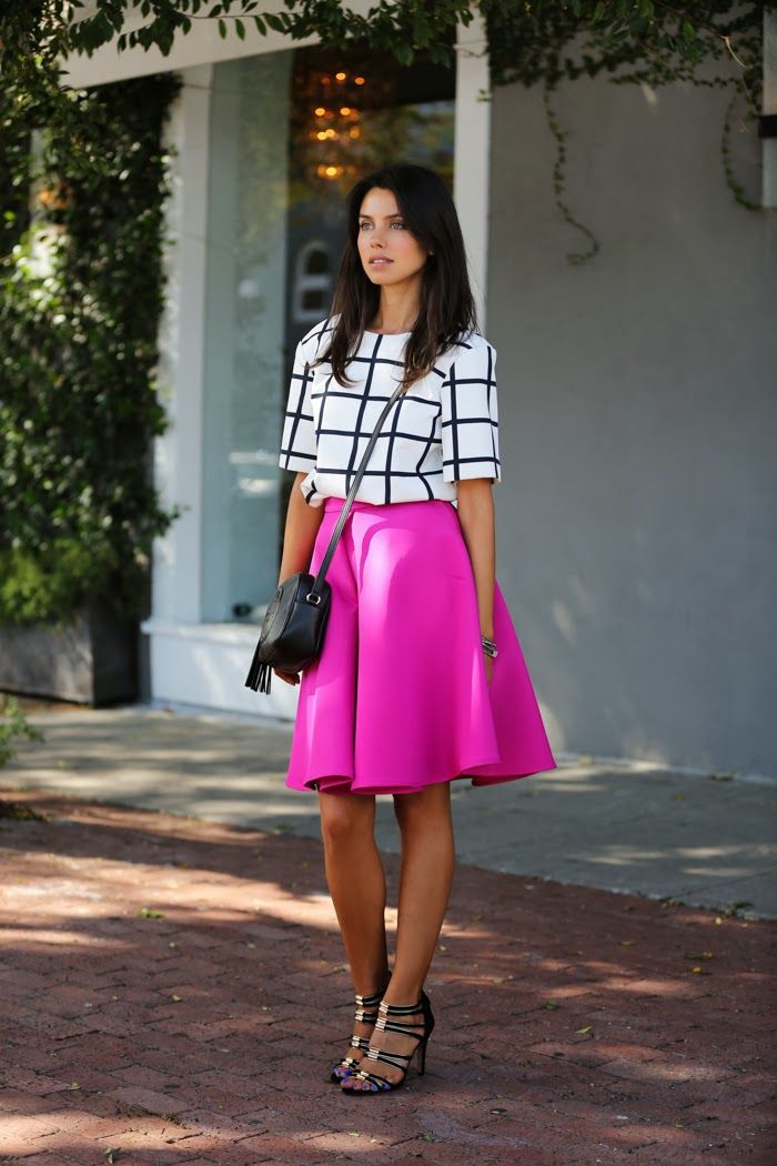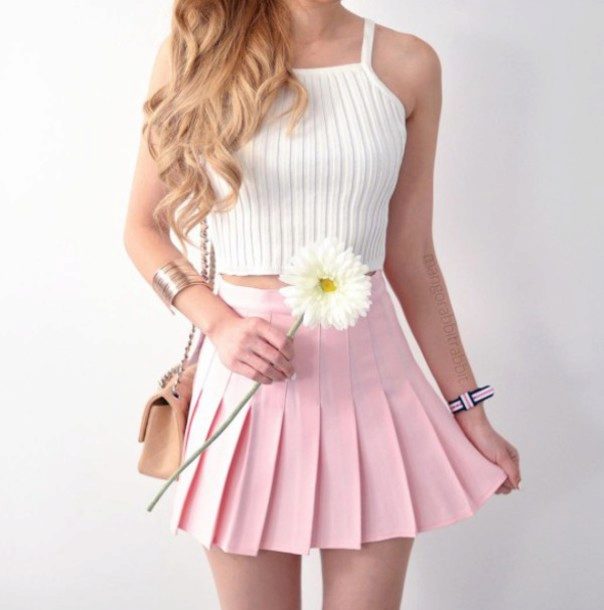 - You can combine tops and blouses with a pink skirt, decorated with a checkered pattern or floral print, but only a pink tint should be present on them.