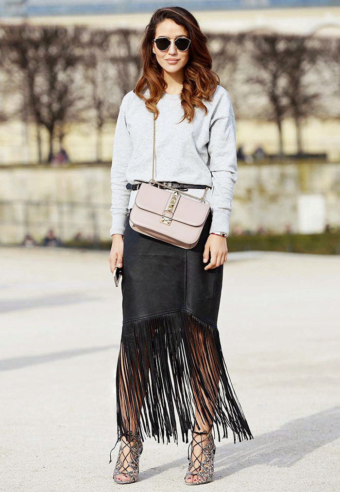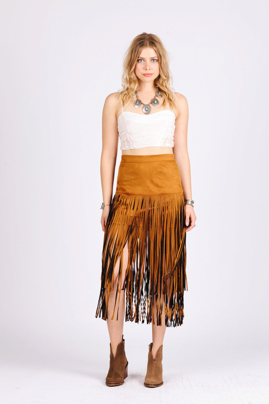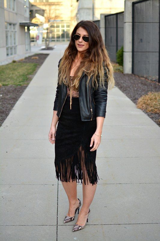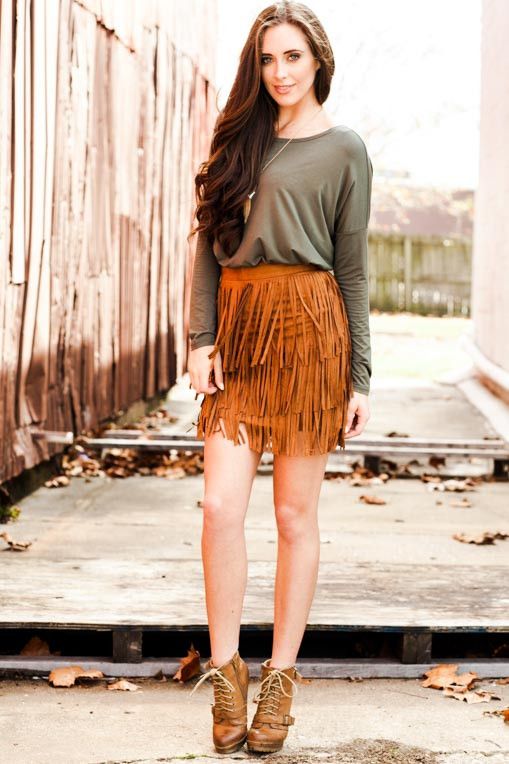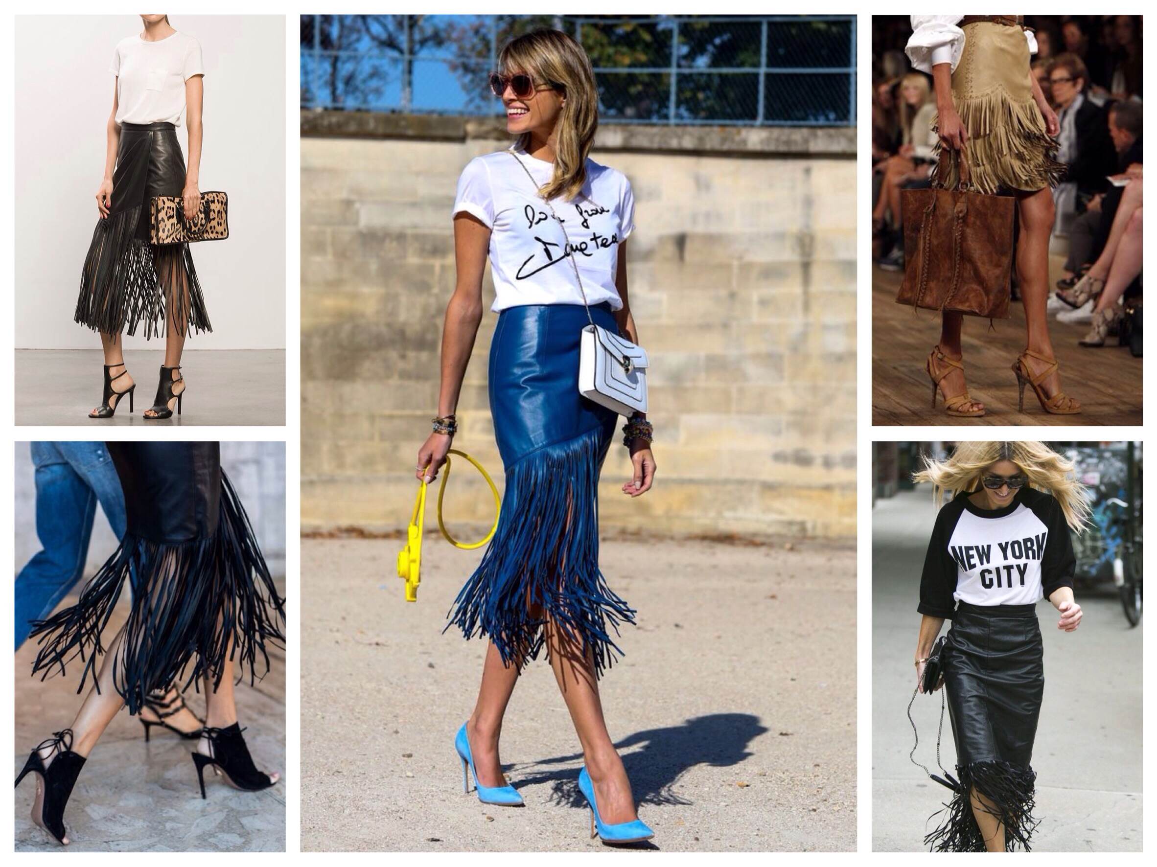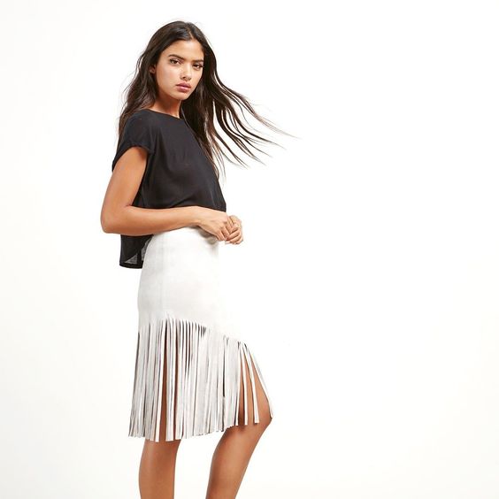 Today, suede skirt and fringe are in trend, so their combination will help to look stylish. Suede skirt with a fringe can be worn with classic pumps, men's shirts and pearls if you are going to work.