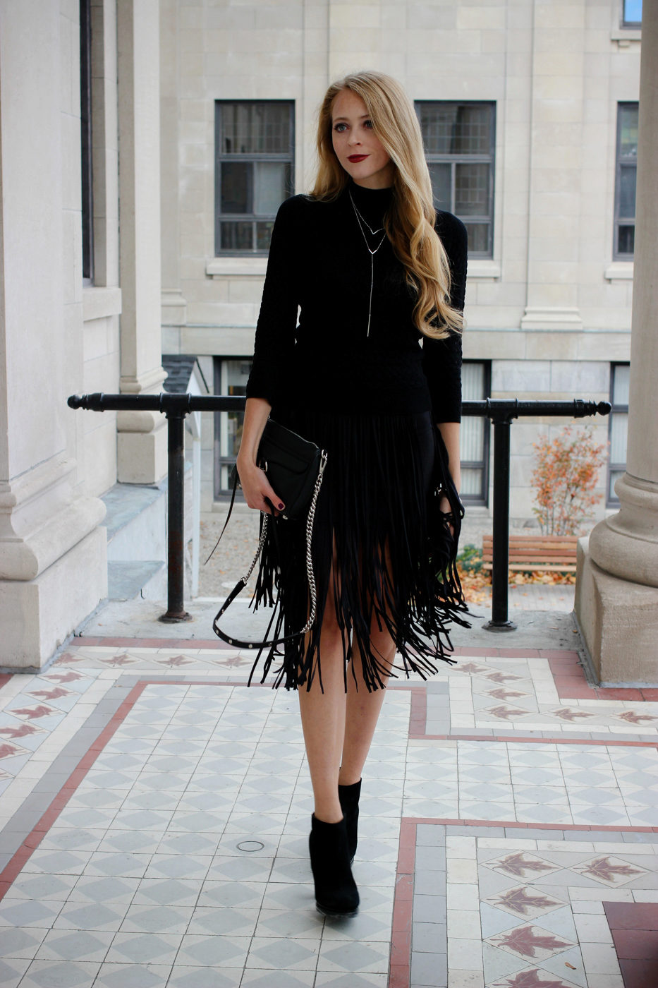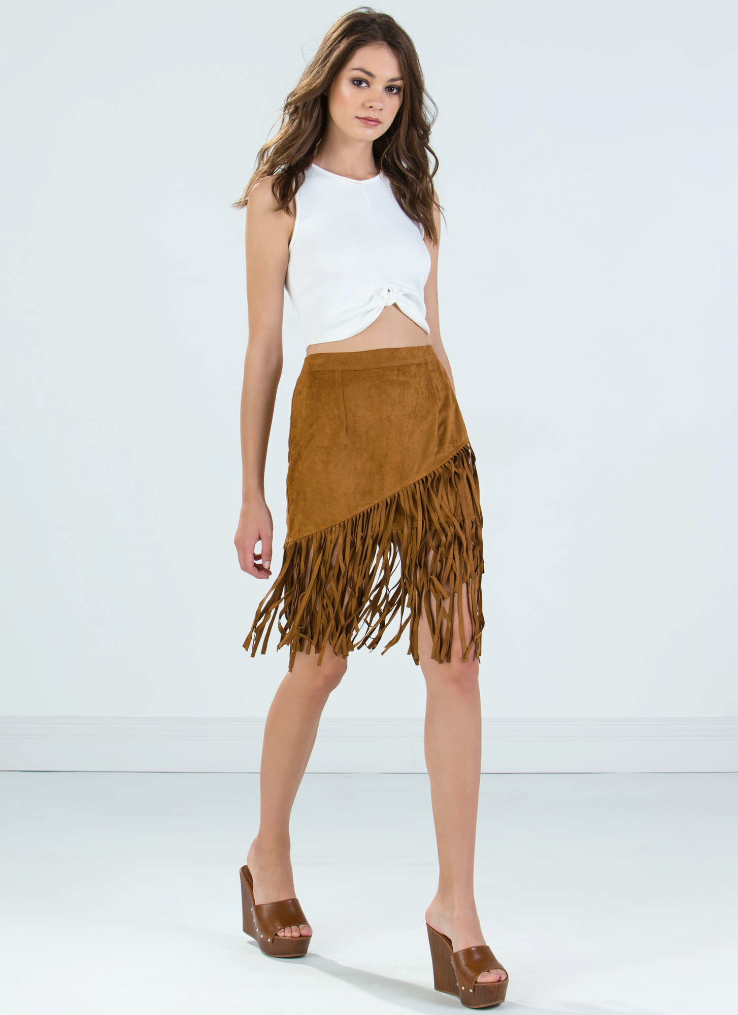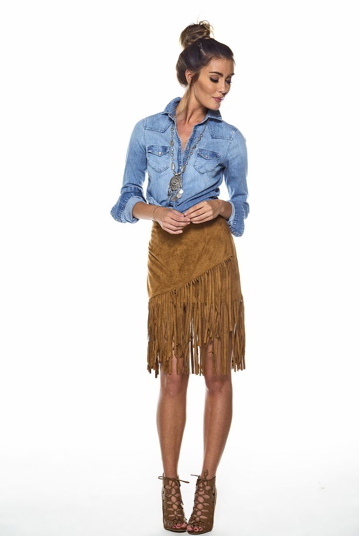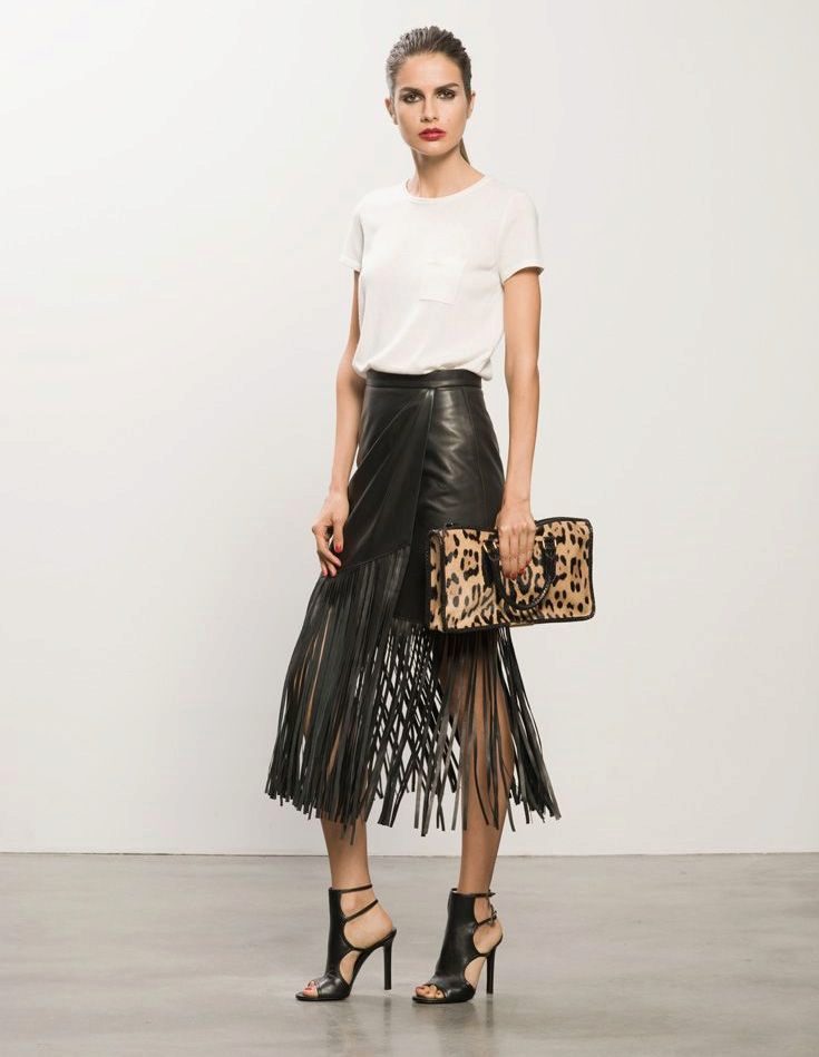 Today, suede skirt and fringe are in trend, so their combination will help to look stylish. Suede skirt with a fringe can be worn with classic pumps, men's shirts and pearls if you are going to work.