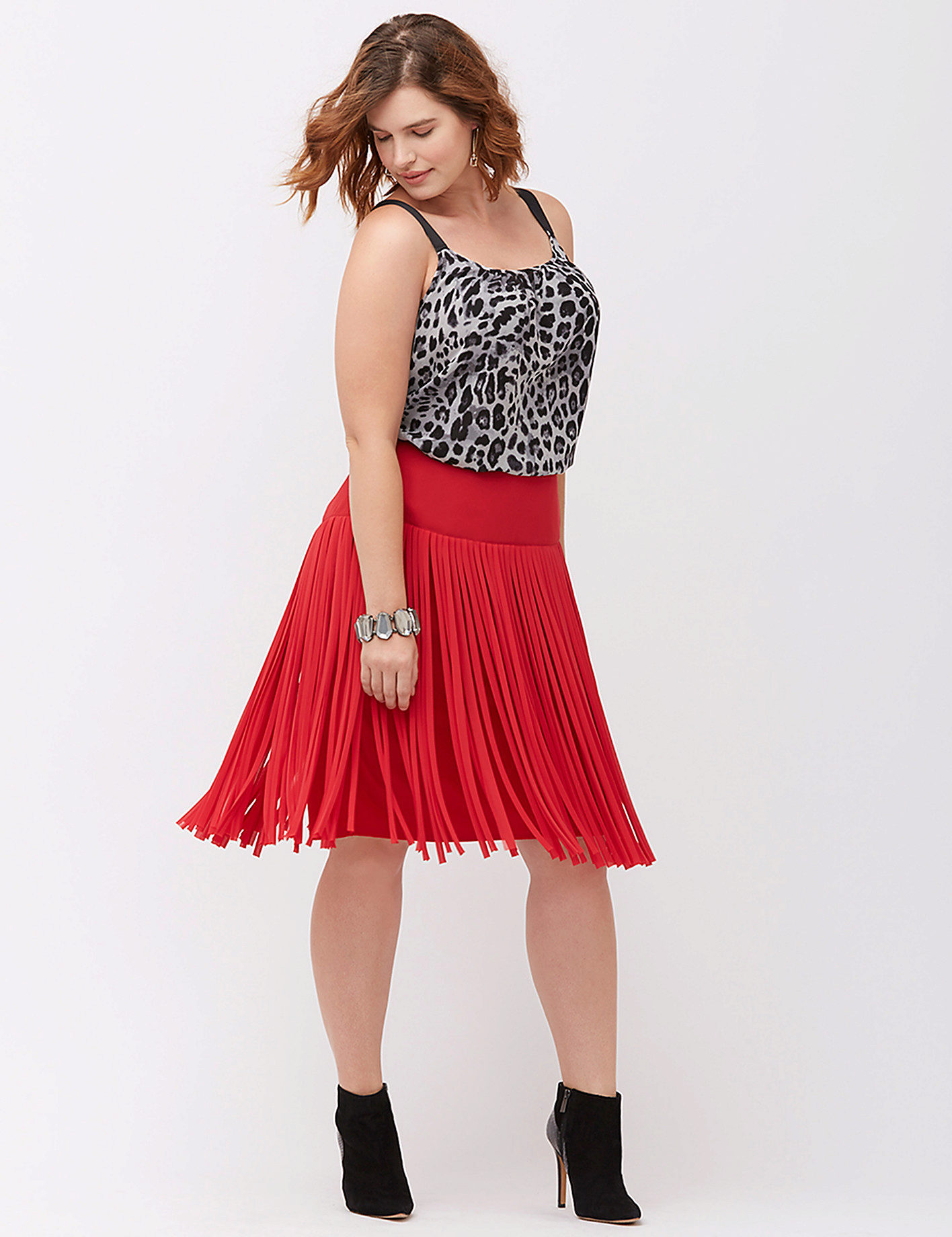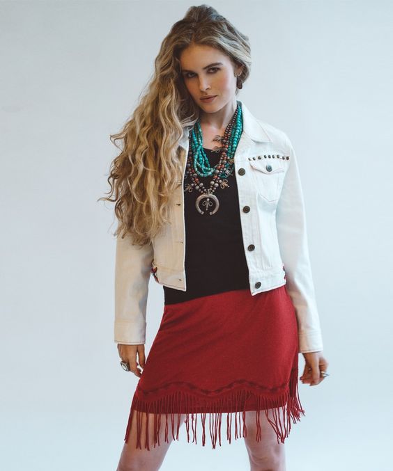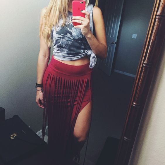 The red skirt with black fringe looks very stylish.Under this outfit you can choose a white or black blouse, T-shirt or top.