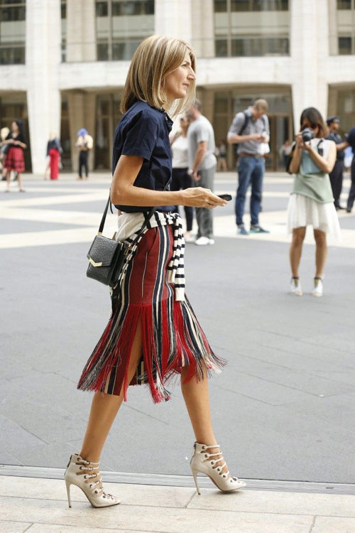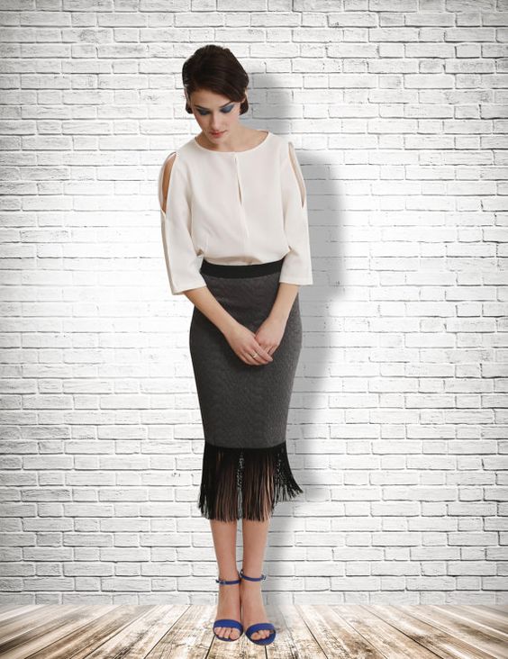 Designers prefer skirts with a fringe of length mini or midi. Thus, a medium-length skirt blends beautifully with simple knitwear tops, sweaters or T-shirts. A top or T-shirt tucked into a fringed skirt belt will look stylish. Skirt to the knee beautifully in tune with shirts.
