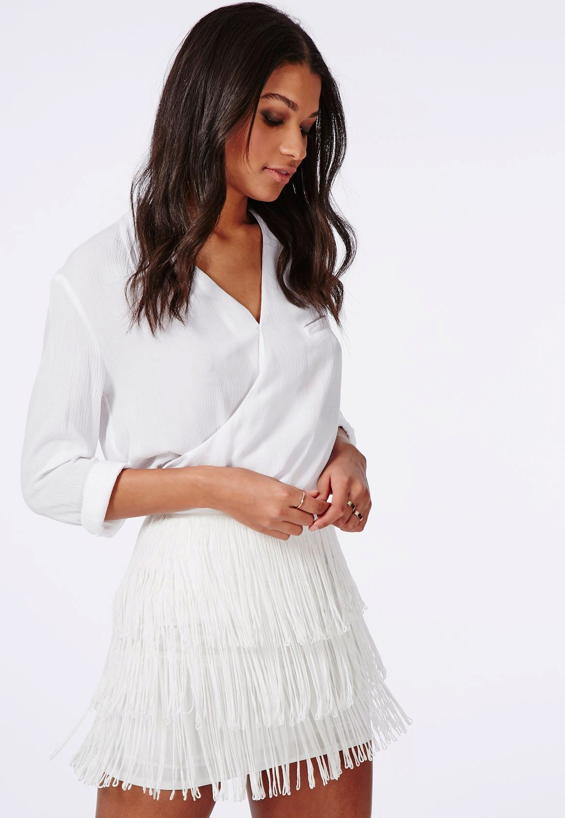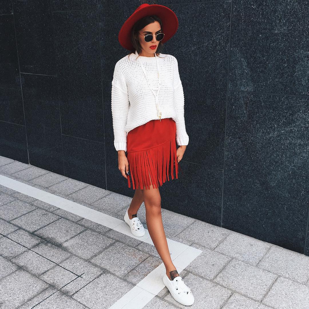 If you need to give the image of boldness and brightness, then a red or pink blouse will be an excellent solution to a white skirt with a fringe.