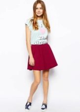 With a plain shirt combined with any skirt. This can be a daring mini, strict midi or luxurious maxi. Since eclecticism is now in fashion, you can safely wear an evening skirt in everyday life, complementing it with a concise T-shirt. Fans of the style can even afford a t-shirt with an inscription or a nice print, and for beginners it is worthwhile to dwell on a monophonic one.