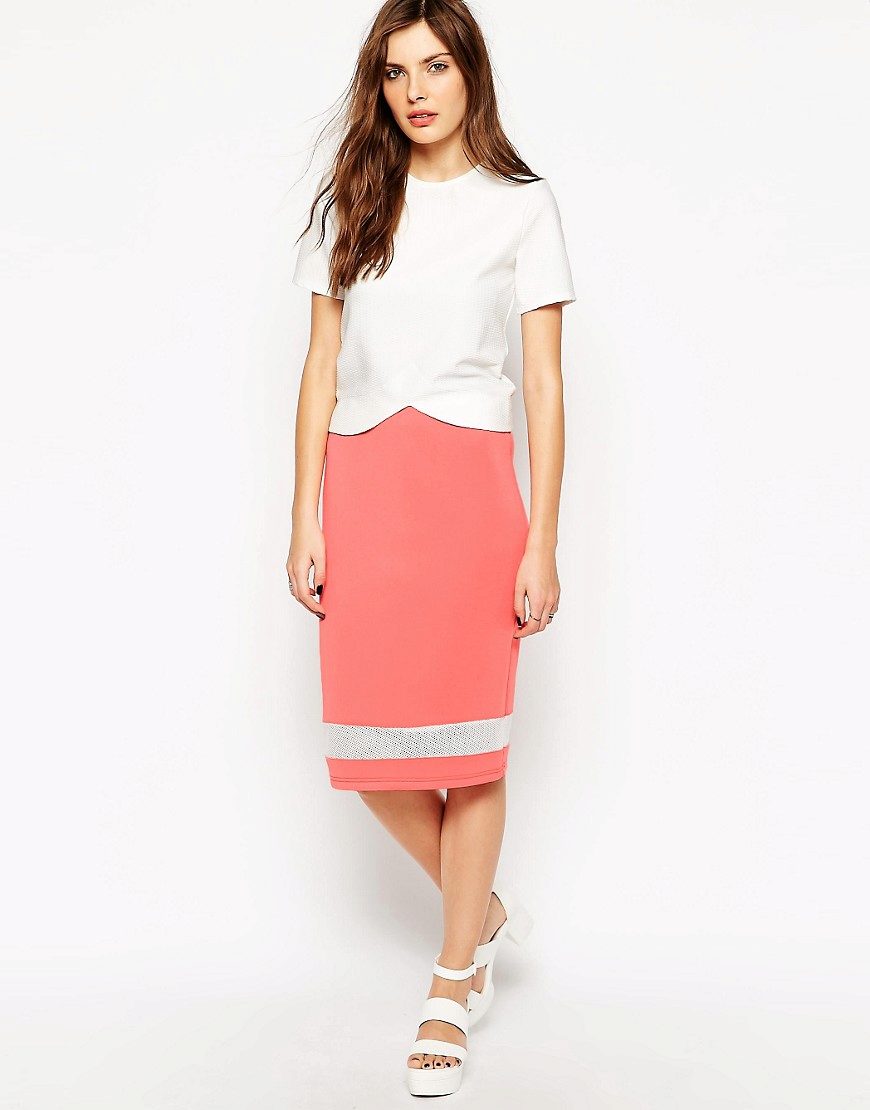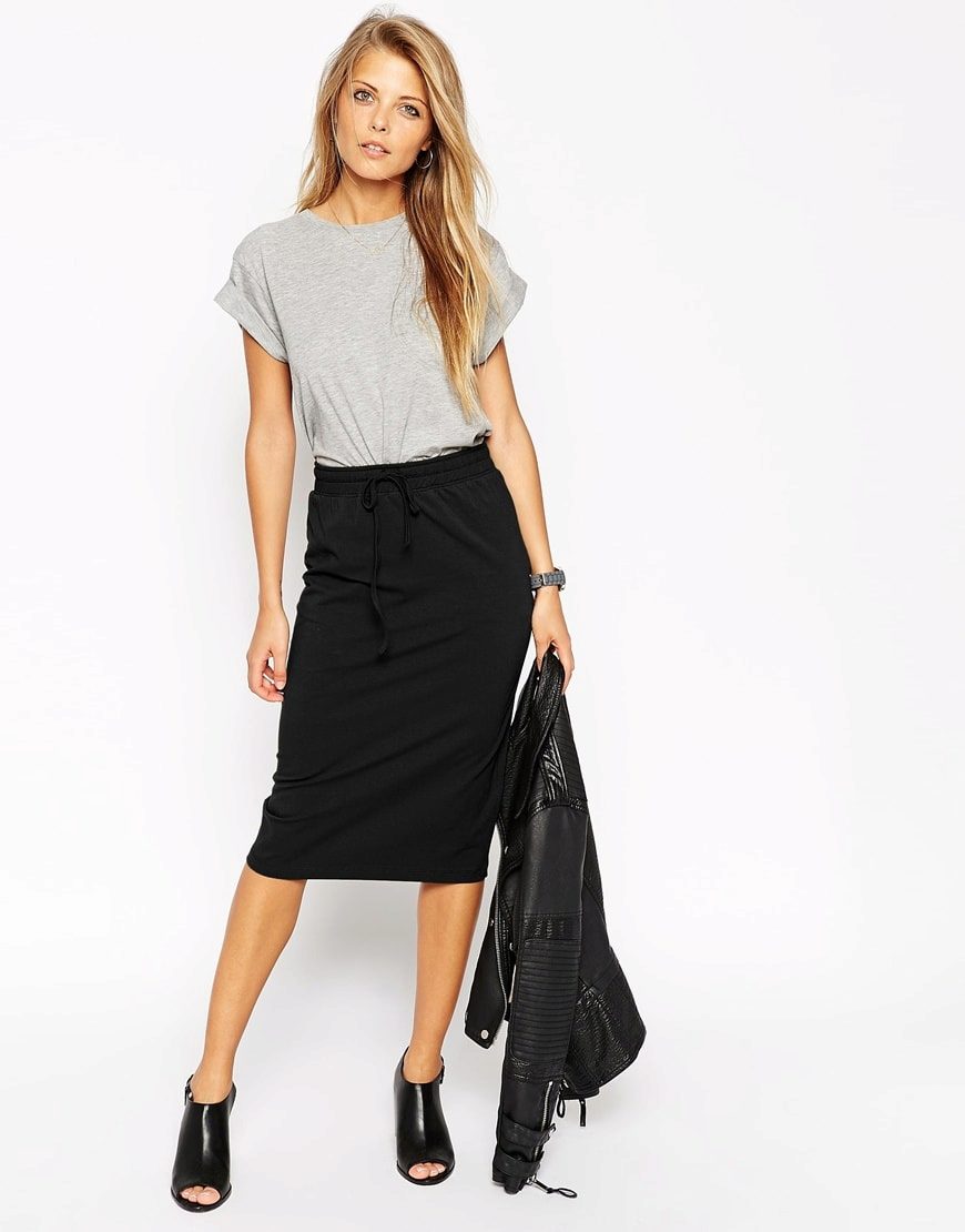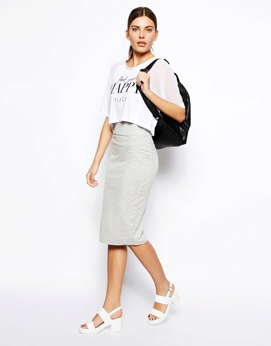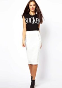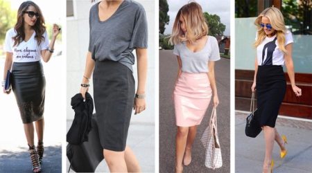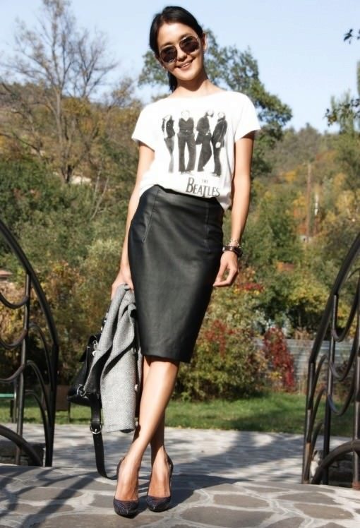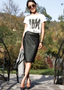 If you want to create a stylish casual look, choose a knitted, denim or leather pencil skirt, which can be complemented with both a plain and bright printed T-shirt. If it's cool outside, you can wear a denim jacket or cardigan from above.Choose shoes for your taste: sandals or platform shoes, ankle boots, gym shoes, ballet flats.