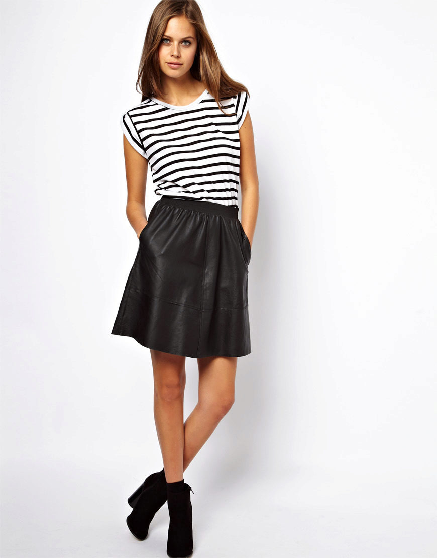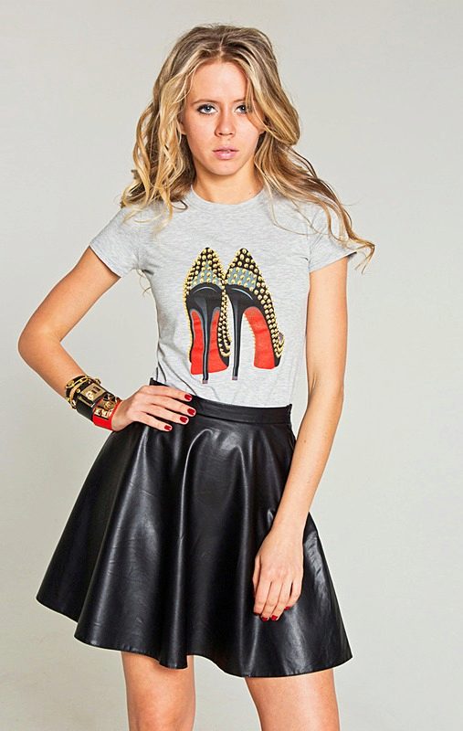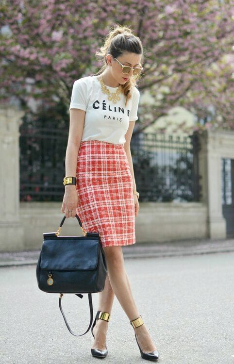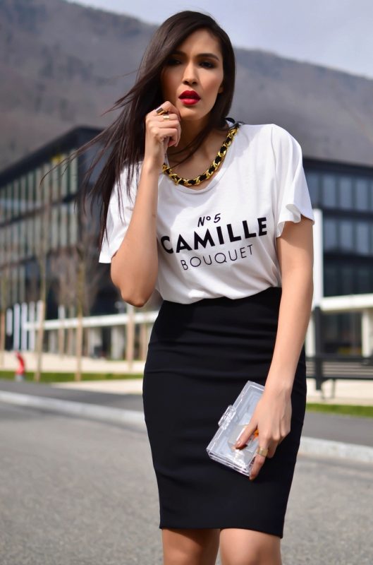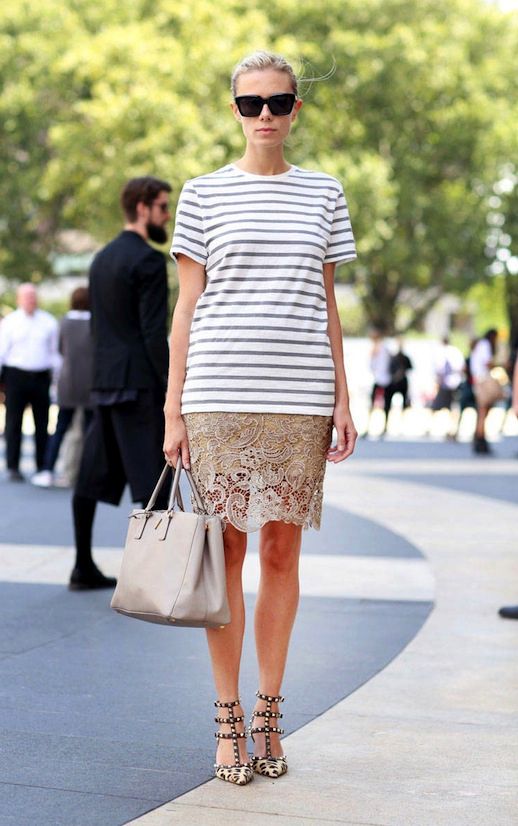 Remember to keep the proportions: a pencil skirt and a boyfriend T-shirt, a fluffy skirt and a tight T-shirt.