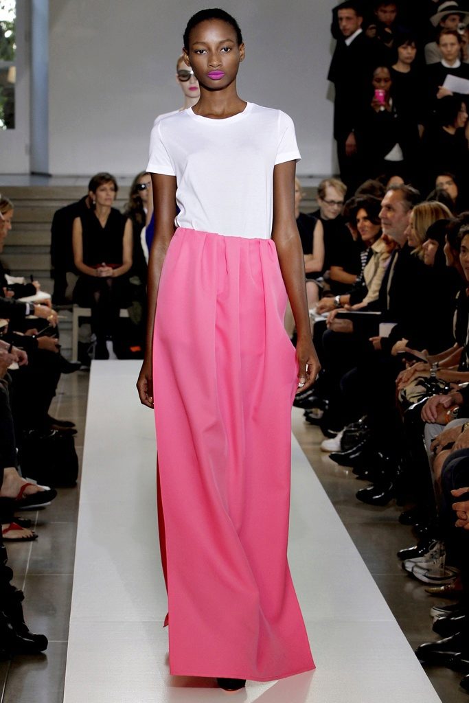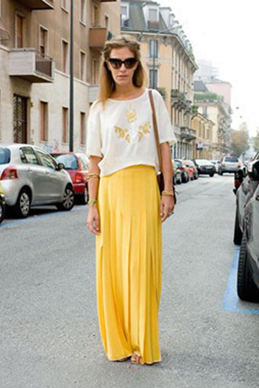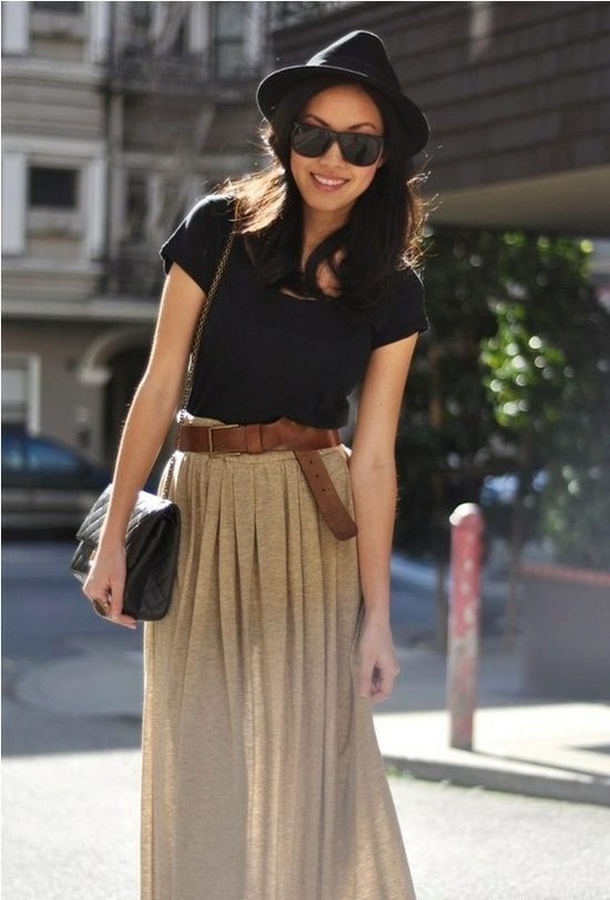 In hot summer there is nothing better than a floor skirt and a light simple T-shirt made of soft knitwear. If you prefer a fluffy skirt, the T-shirt should be tight-fitting or slim. With a straight maxi skirt, an oversize t-shirt would be a better fit. If you do not have such a wardrobe, you can borrow it from your boyfriend. Wearing it must be deliberately careless, tucked only on one side. Light sandals or sneakers are perfect for this look.