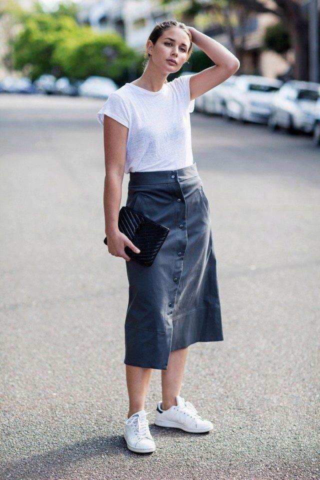 Lovers of casual style can safely wear a skirt with sneakers or sneakers, which today are combined with any clothes. Pick a neat model in a sporty style, then it will look elegant and stylish.