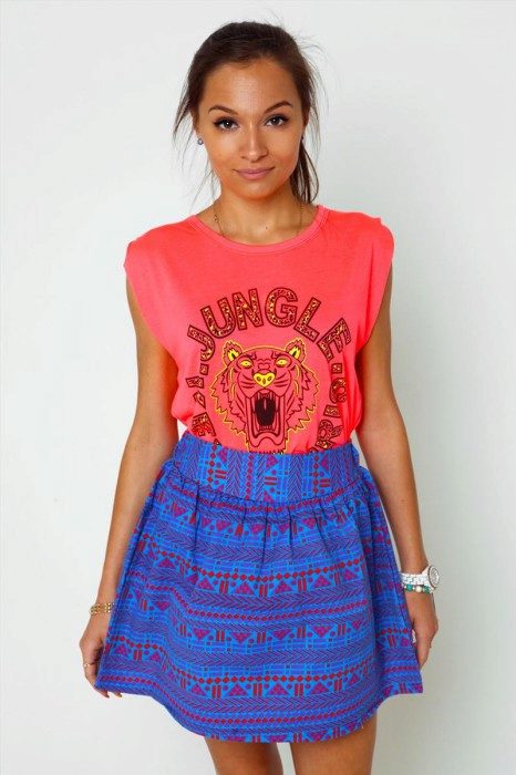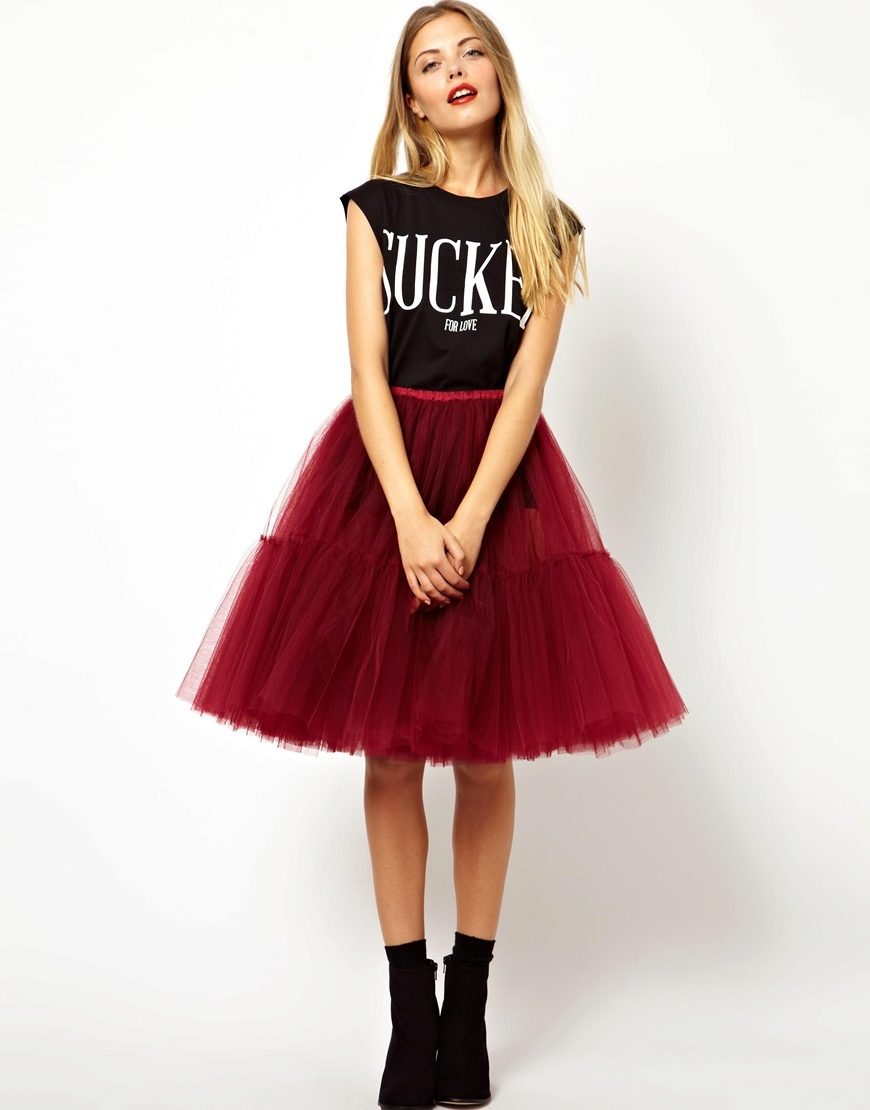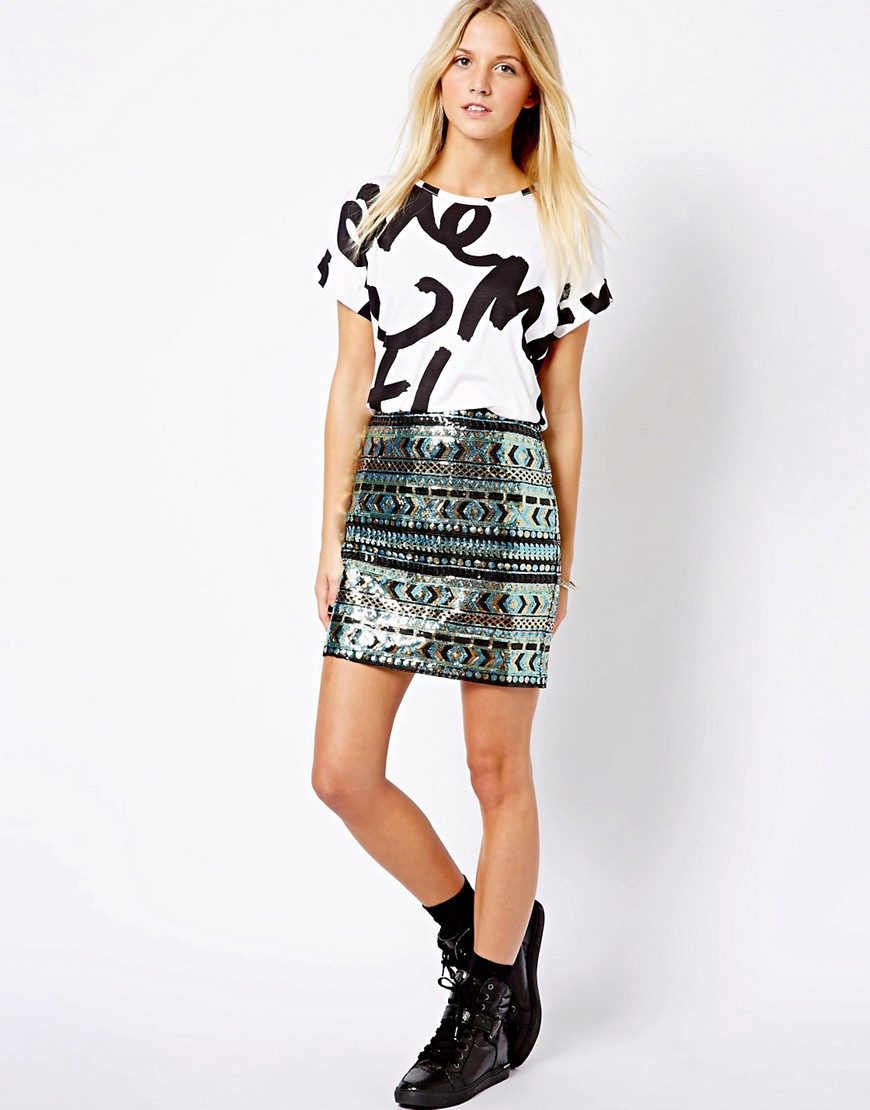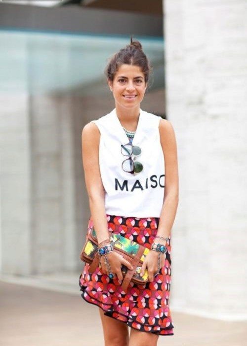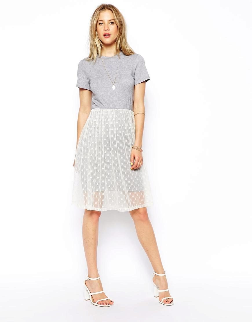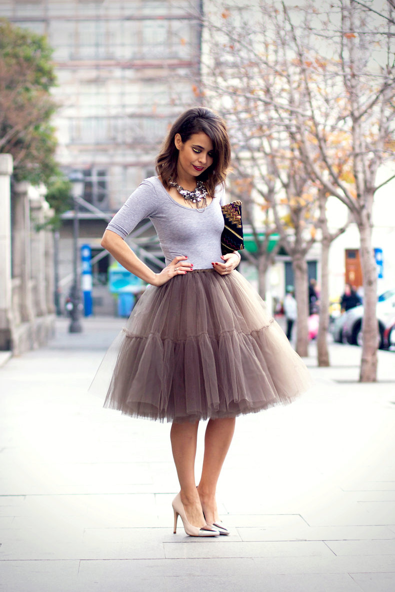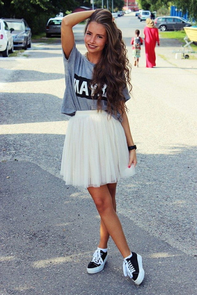 This is a great option for publication, especially if you wear a massive necklace or pendant. In everyday life, not to look like a ballerina, choose a T-shirt with a contrast print or a spectacular lettering. Regarding the shoes there are no restrictions, it can be pumps or stiletto sandals, ballet flats, gym shoes or even sneakers. Sporty shoes perfectly complement the eclectic look.