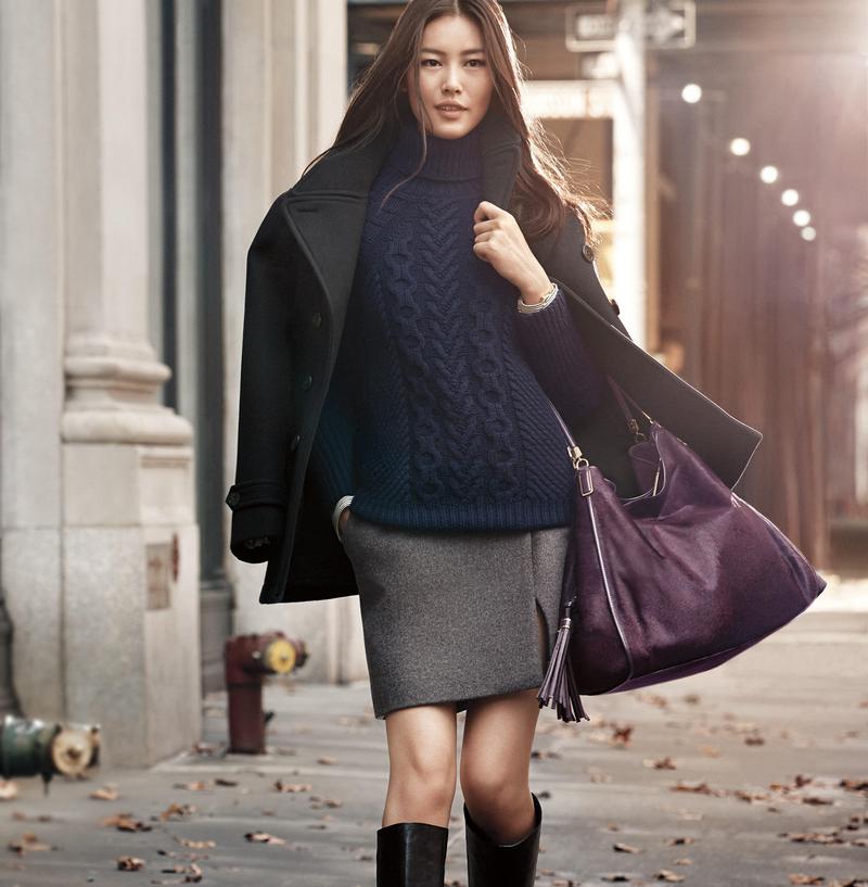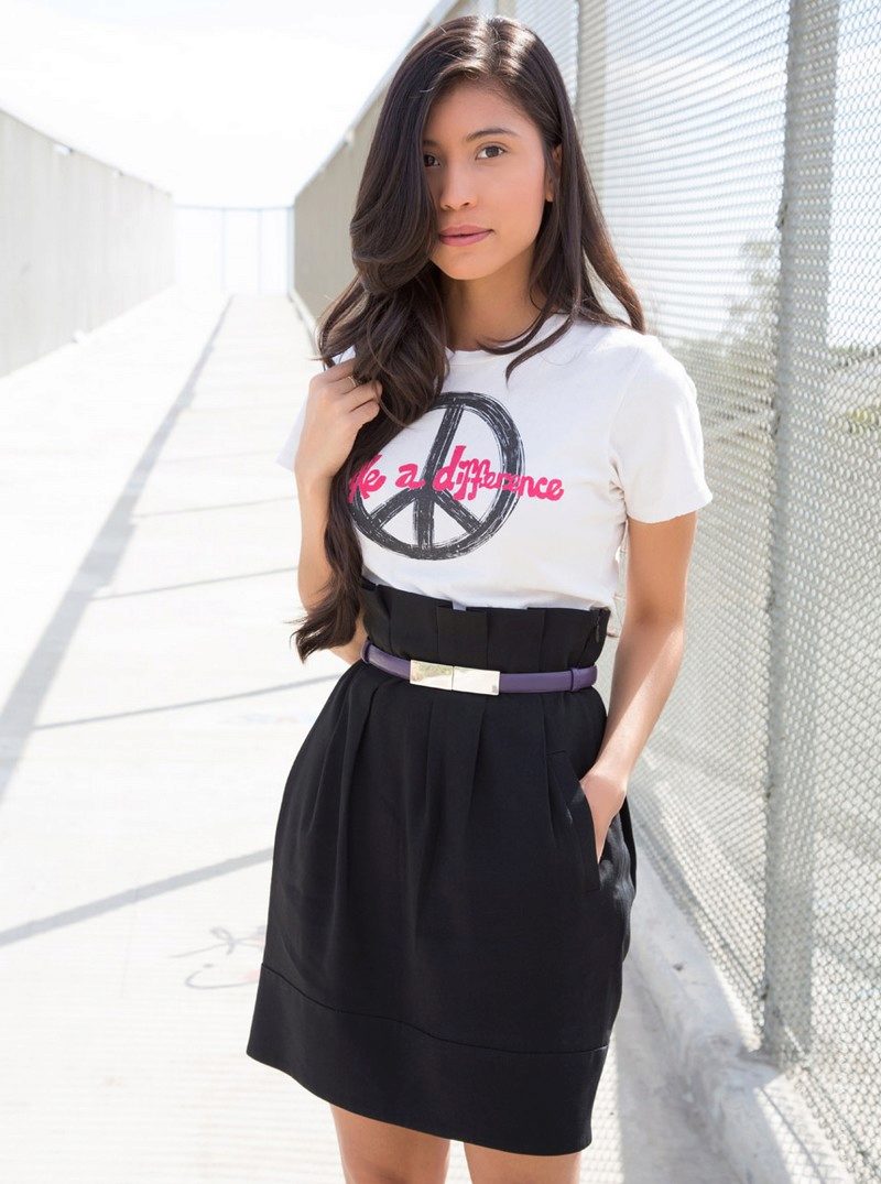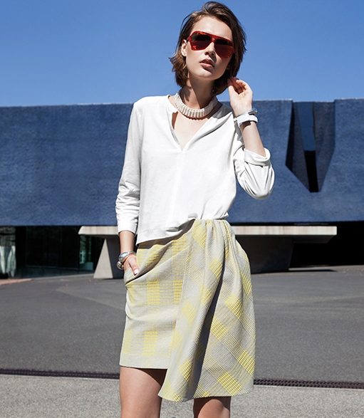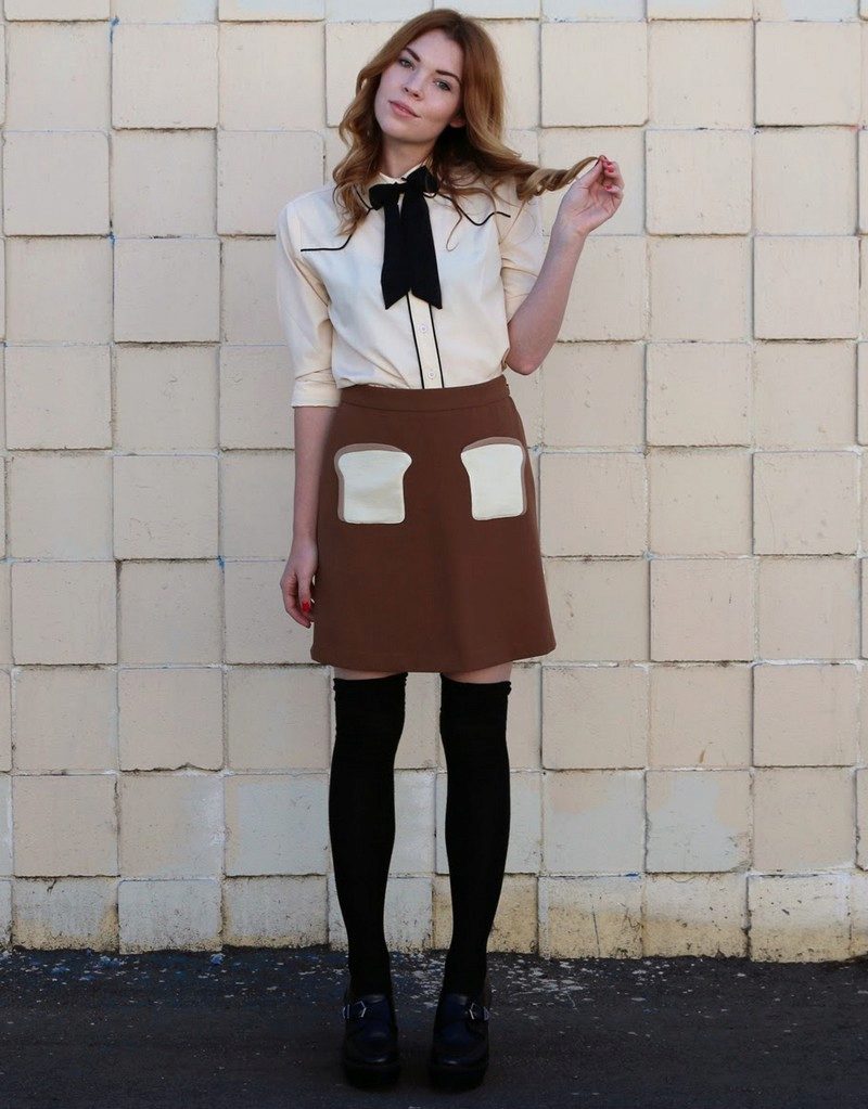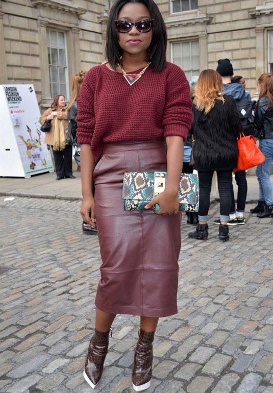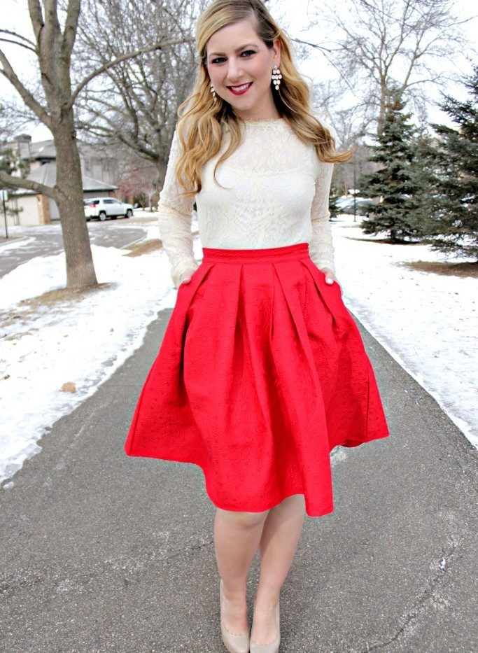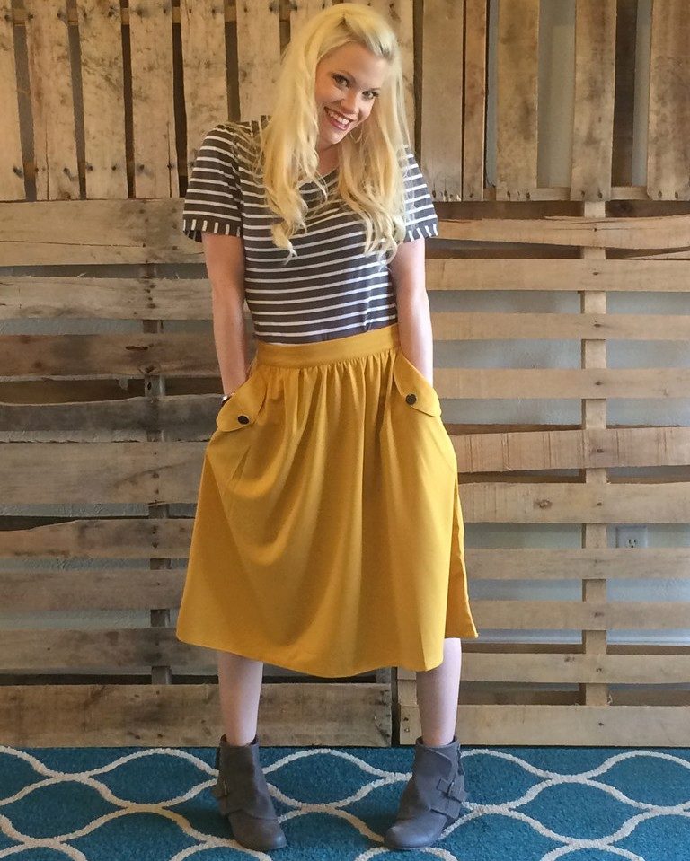 If this is a business style skirt with hidden pockets, then a classic blouse or shirt would be best for her. For casual skirts with pockets, you can wear a turtleneck, top, shirt, blouse, t-shirt or jersey. It all depends on the style of the skirt itself, as well as on the season.