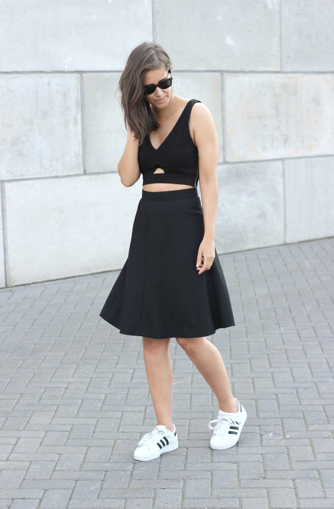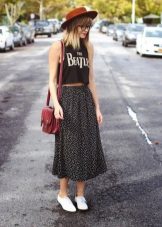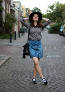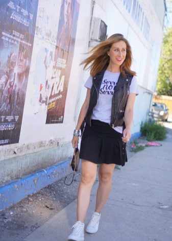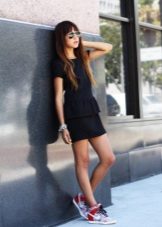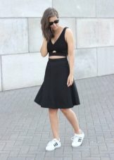 Sneakers perfectly combined with different styles, but the exception is classic skirts. You also need to carefully select the top for such an unusual combination. A variety of T-shirts, cropped tops and sports jerseys go well with a skirt and sneakers. Do not forget about the chiffon blouse and shirt.