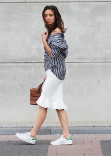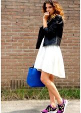 White sneakers with low soles are versatile, they are suitable for any style of skirt. They can be worn with denim or puffy skirts mini length. Among the lush models is to provide a skirt trapeze, sun, with frills or pleated.