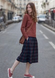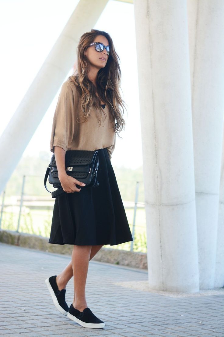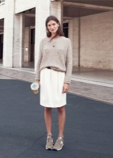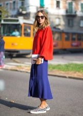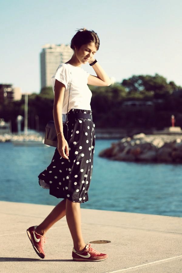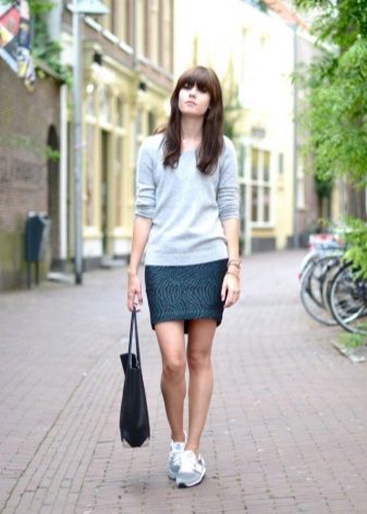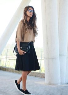 A-line skirts slightly below the knee blend beautifully with sneakers. Among the wide variety of midi skirts, preference should be given to straight cut skirts, knitwear, style sun or Tatyanka. Very beautiful with sneakers looks puffed skirt to the knee, many fashionable women prefer tulle. An interesting combination of sophistication and convenience.
