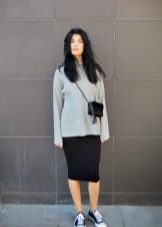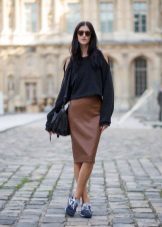 A leather pencil skirt looks beautiful with a top, cardigan or jacket, while choosing shoes, you can stay on sneakers, but they should be in tune with one of the elements of clothing. For an informal meeting or a walk, you can create a unique bow thanks to a knitted pencil skirt, casual top and sneakers. Some fashionable women create quite bold combinations.