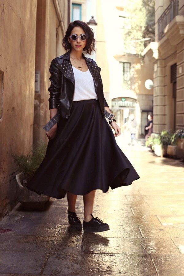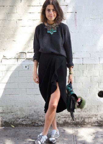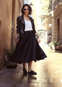 Skirt in the floor with sports shoes allows you to show your personality, go against the rules and look spectacular. For a walk with friends, you can wear a T-shirt with a long skirt and sneakers, on top of you can choose a jacket or a military-style jacket. To create a stylish look, a skirt with sneakers must be combined with a top or a volume sweater.