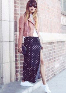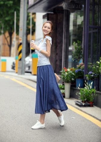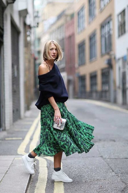 A long skirt looks beautiful in combination with sneakers, but you should prefer models of free cut from light fabric. Also among the models of maxi length can be worn with flared skirt sneakers, pleated, straight cut with sexy cuts, with a button closure at the front or with a smell. With a skirt of thick material can not wear sneakers, the exception applies only to models of denim.