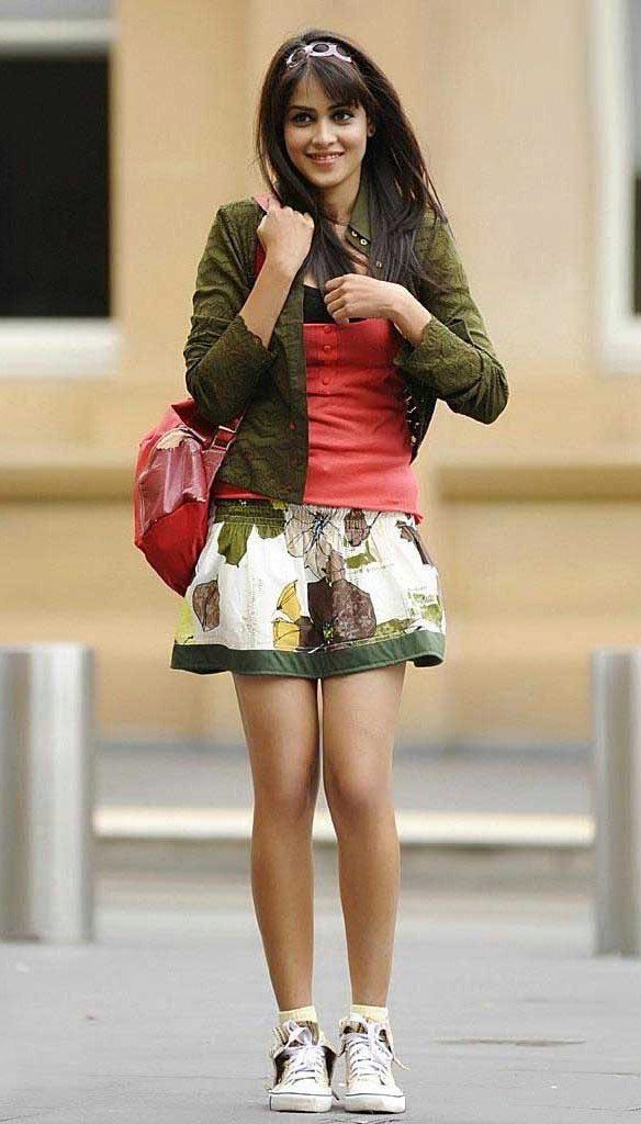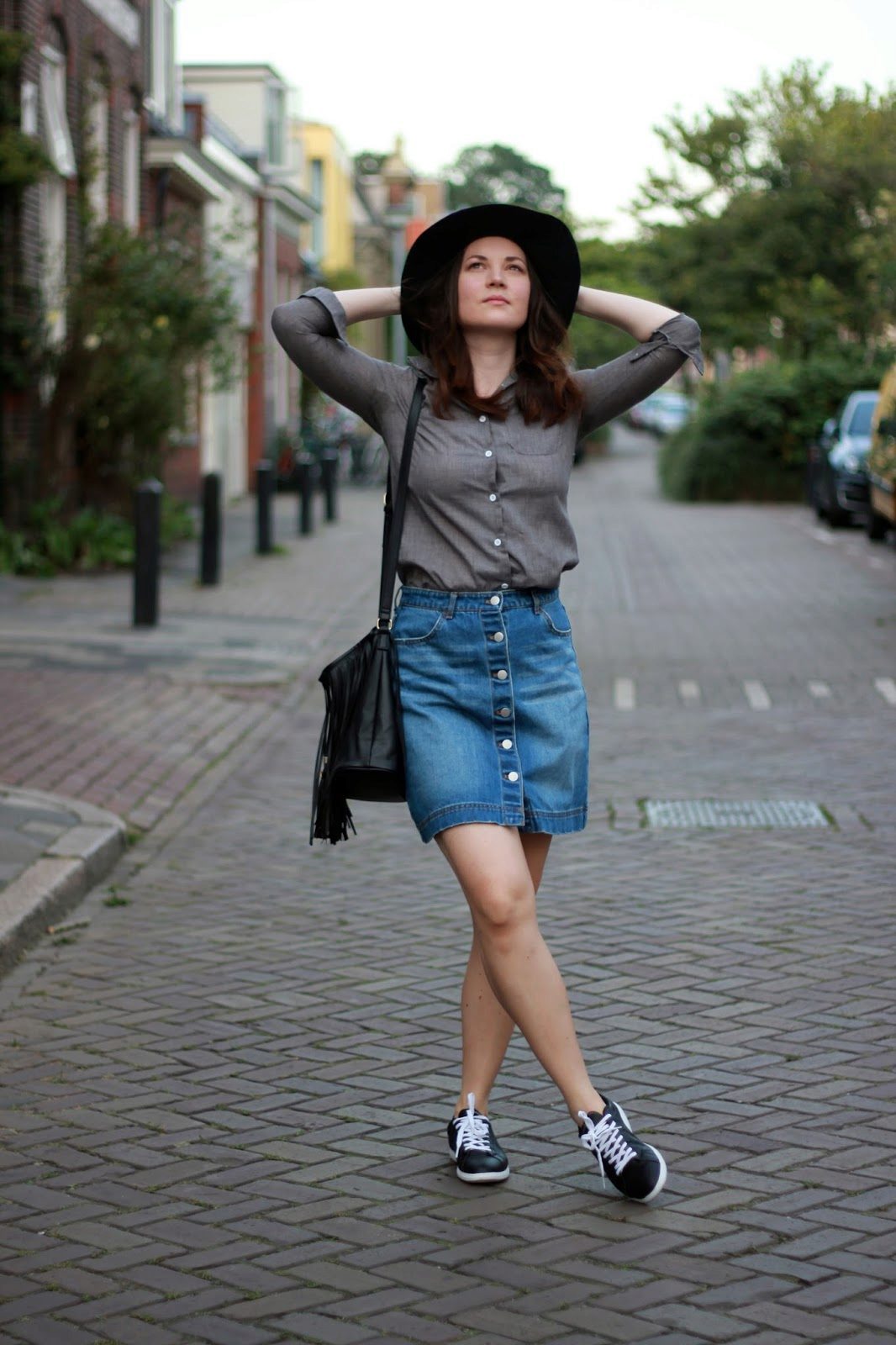 The combination of midi length skirt with high-top sneakers will allow slim girls to hide their legs and give them fullness.