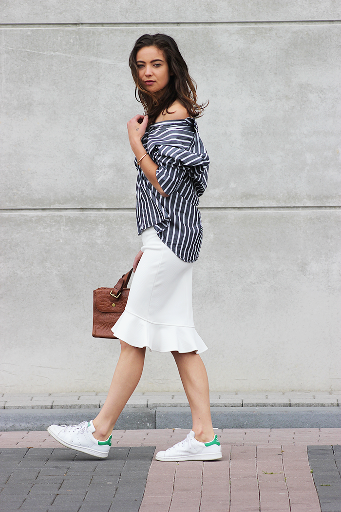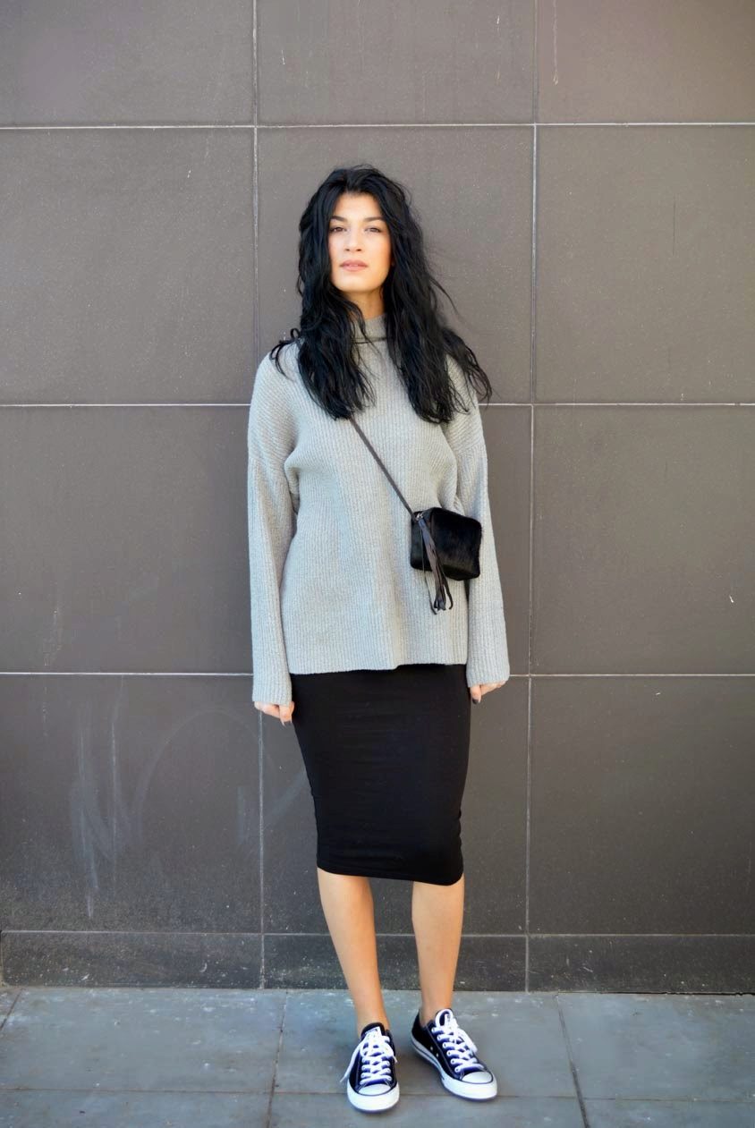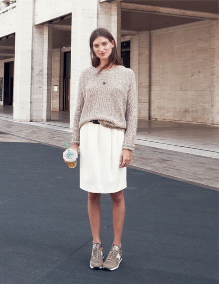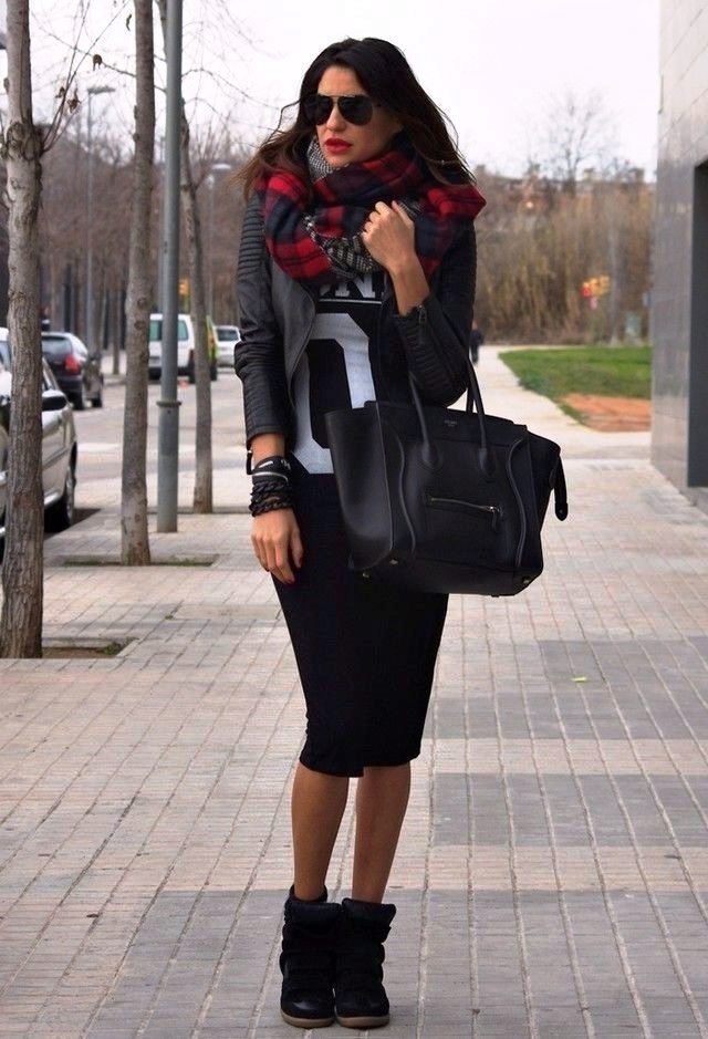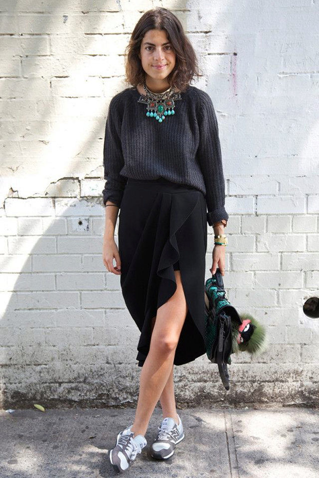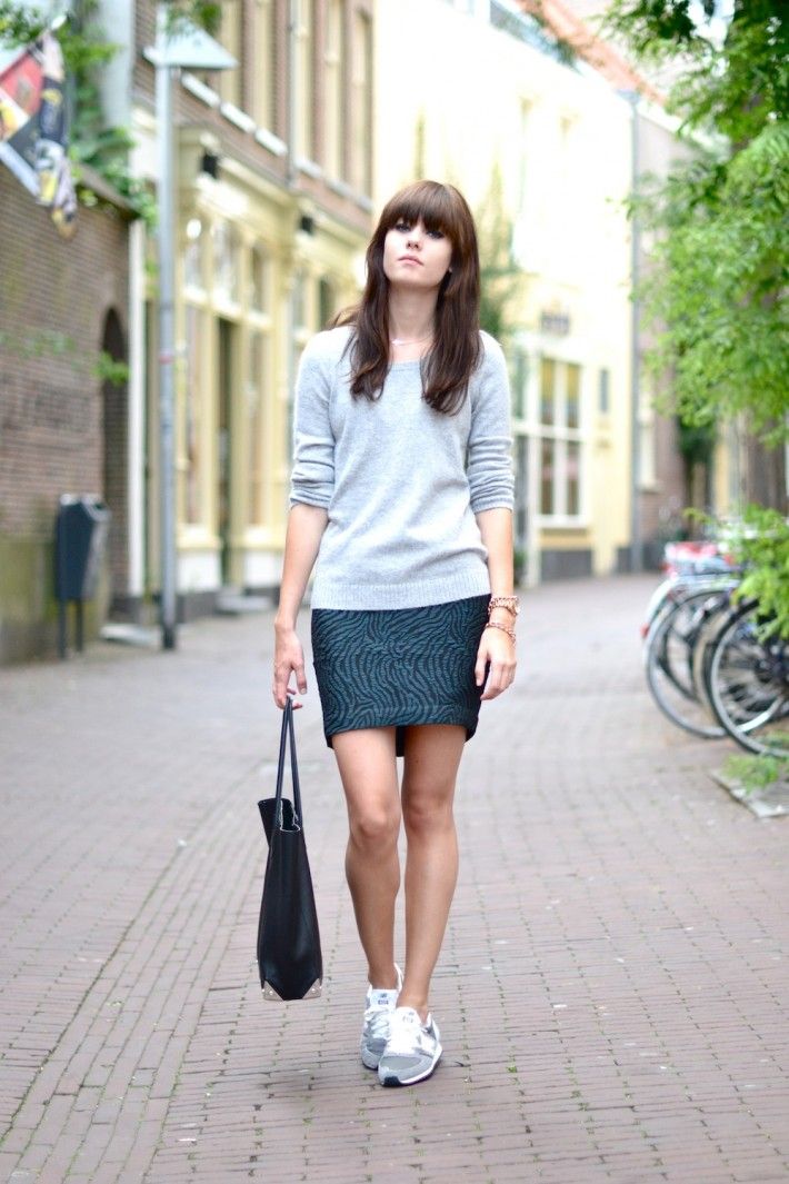 So, a textured pencil skirt with running sneakers and a voluminous coat looks a bit strange, but spectacular. Such complex combinations should be created carefully, so as not to look ridiculous.