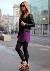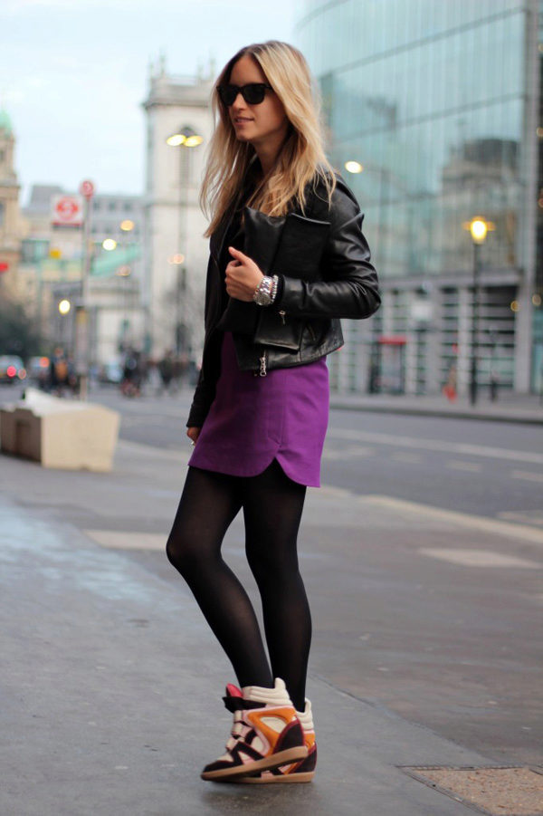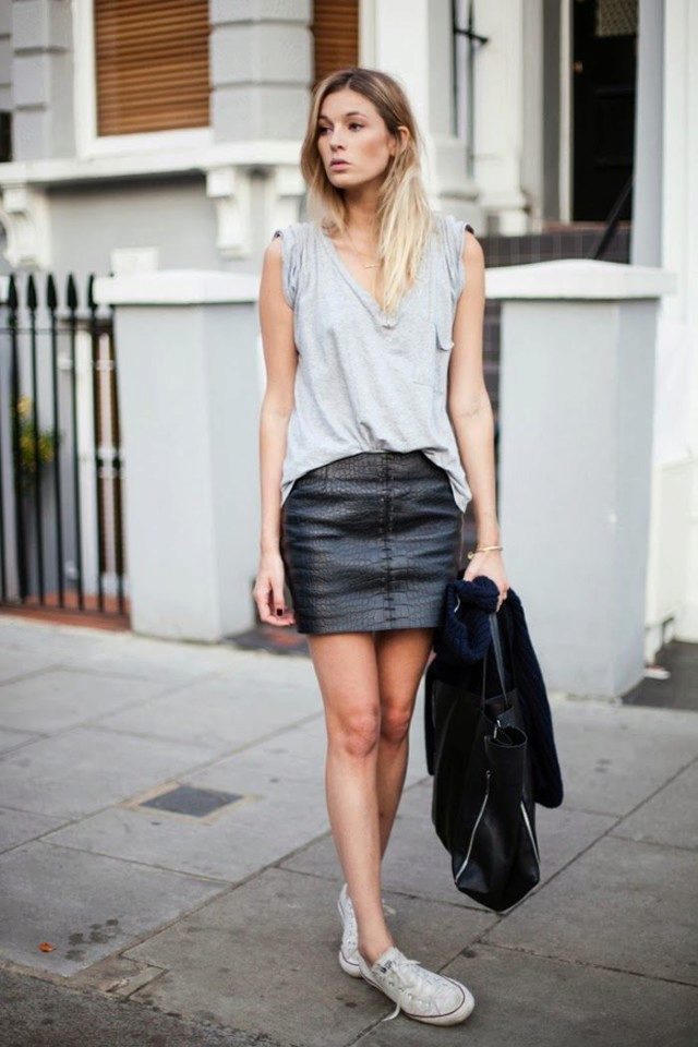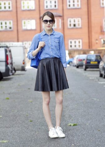 Sneakers are best for short, tight-fitting and puffy leather skirts. The skirt itself can be absolutely any color. The most popular black and white version, but the color models look great.