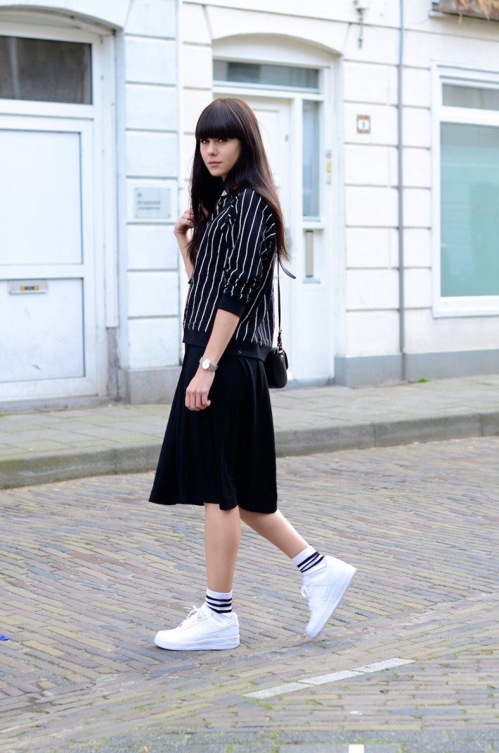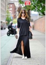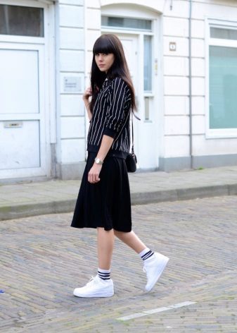 The combination of black sneakers with a skirt is based on the contrast of styles. However, things that are more similar in mood should be selected for dark shoes - models with ruffles or a flower are no longer suitable here.