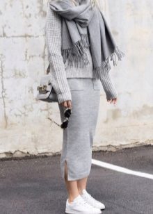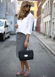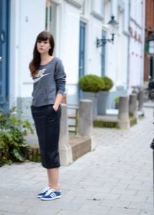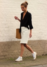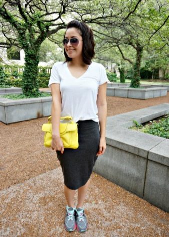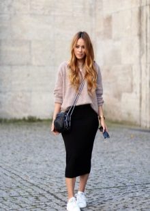 The combination of "pencil skirt + sneakers" looks good in combination with free sweaters or T-shirts. You can complement the image with accessories in a sporty style: a large bag, a thin hat, rubber bracelets, etc.