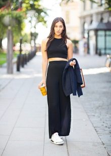 Sneakers will help to soften this, a little aggressive image, adding to it a grain of young immediacy and enthusiasm. The combination of leather clothes and sports shoes looks very eclectic, but no less interesting.