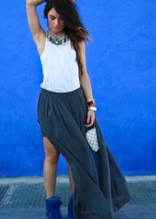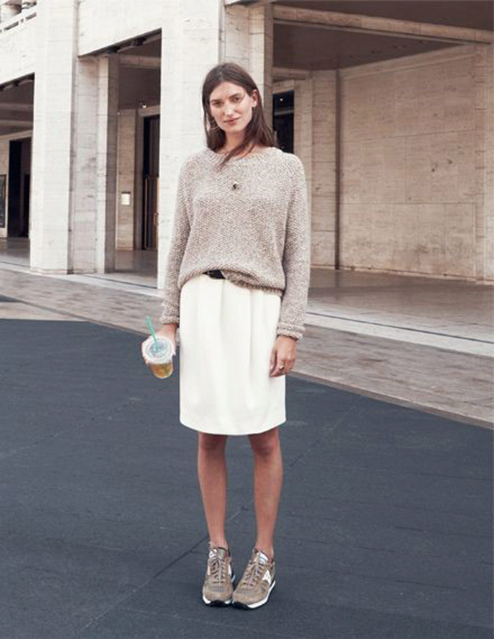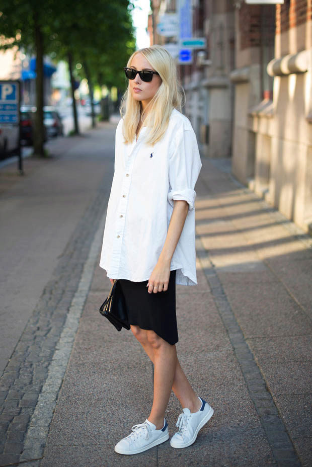 White sneakers are the most neutral of all possible options. They look very elegant, almost without attracting attention. Therefore, white sports shoes go well with light romantic skirts of airy fabrics, such as chiffon.