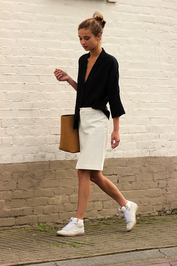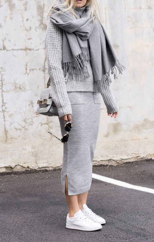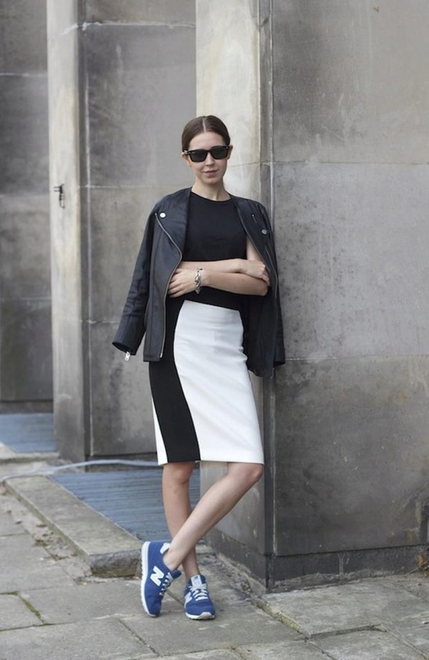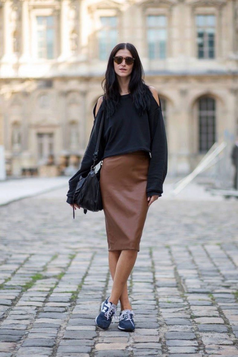 One of the most spectacular pairs for sneakers is a tight pencil skirt. Traditionally, this model belongs to the classical or business style. However, in combination with informal shoes, a strict pencil skirt begins to play in a new way.